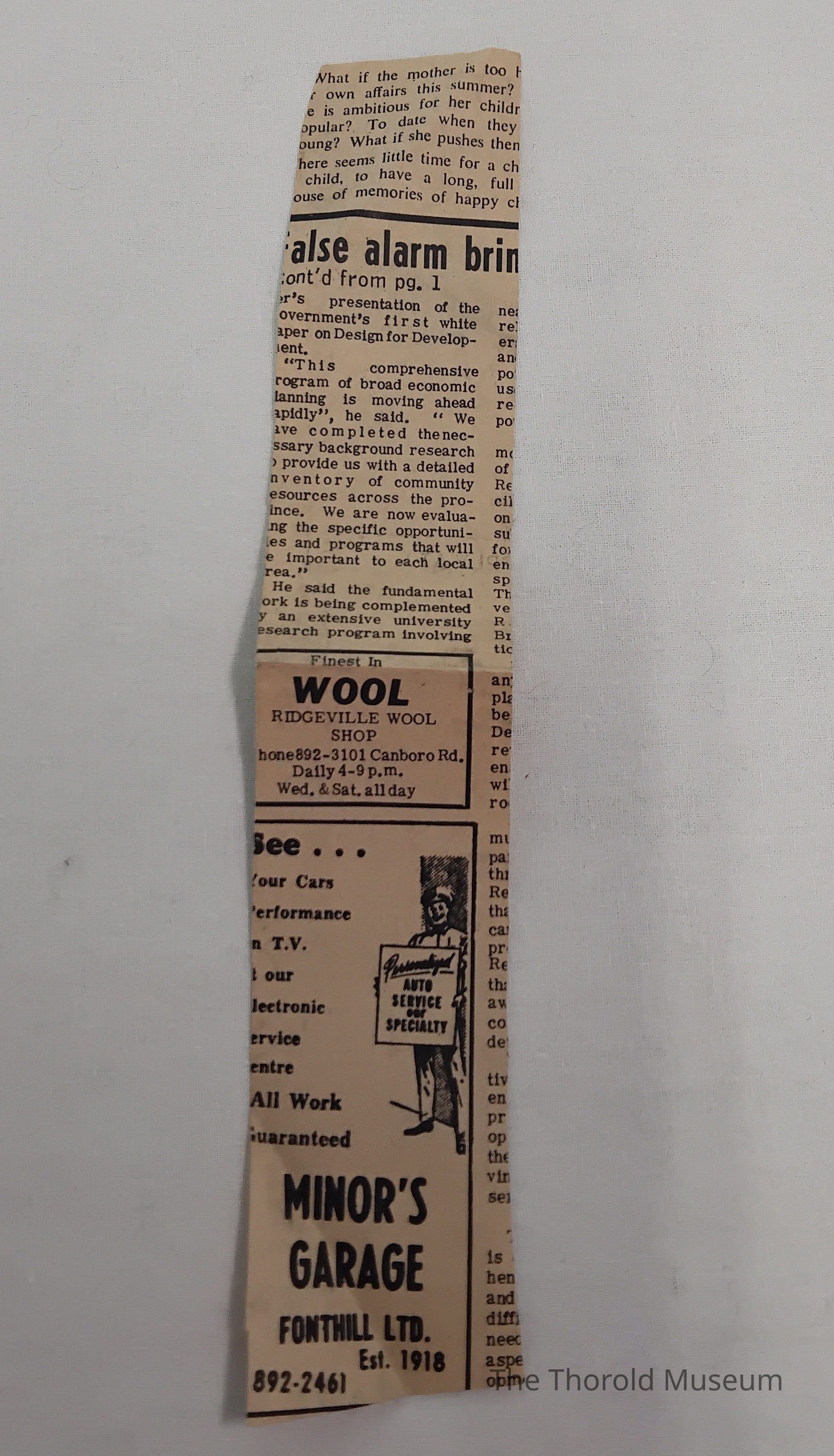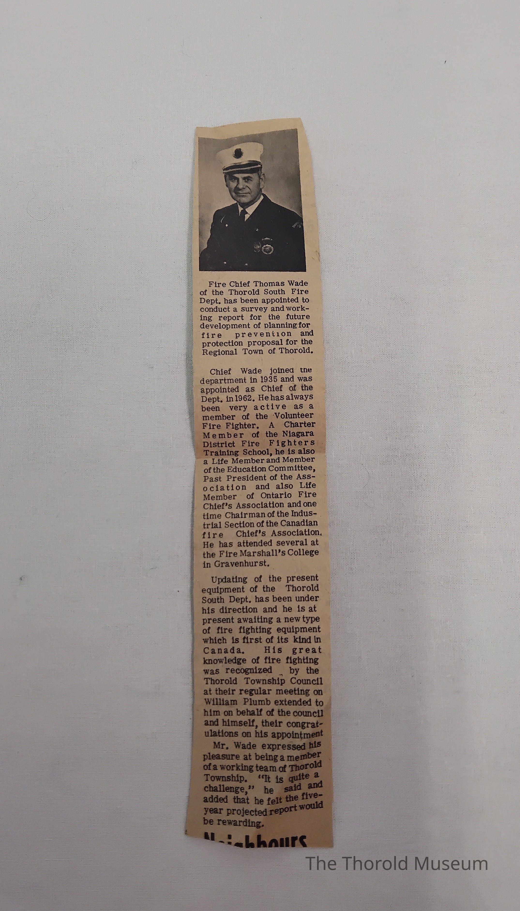 A long thin strip of newspaper with an article about Fire Chief Tom Wade