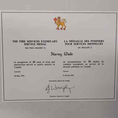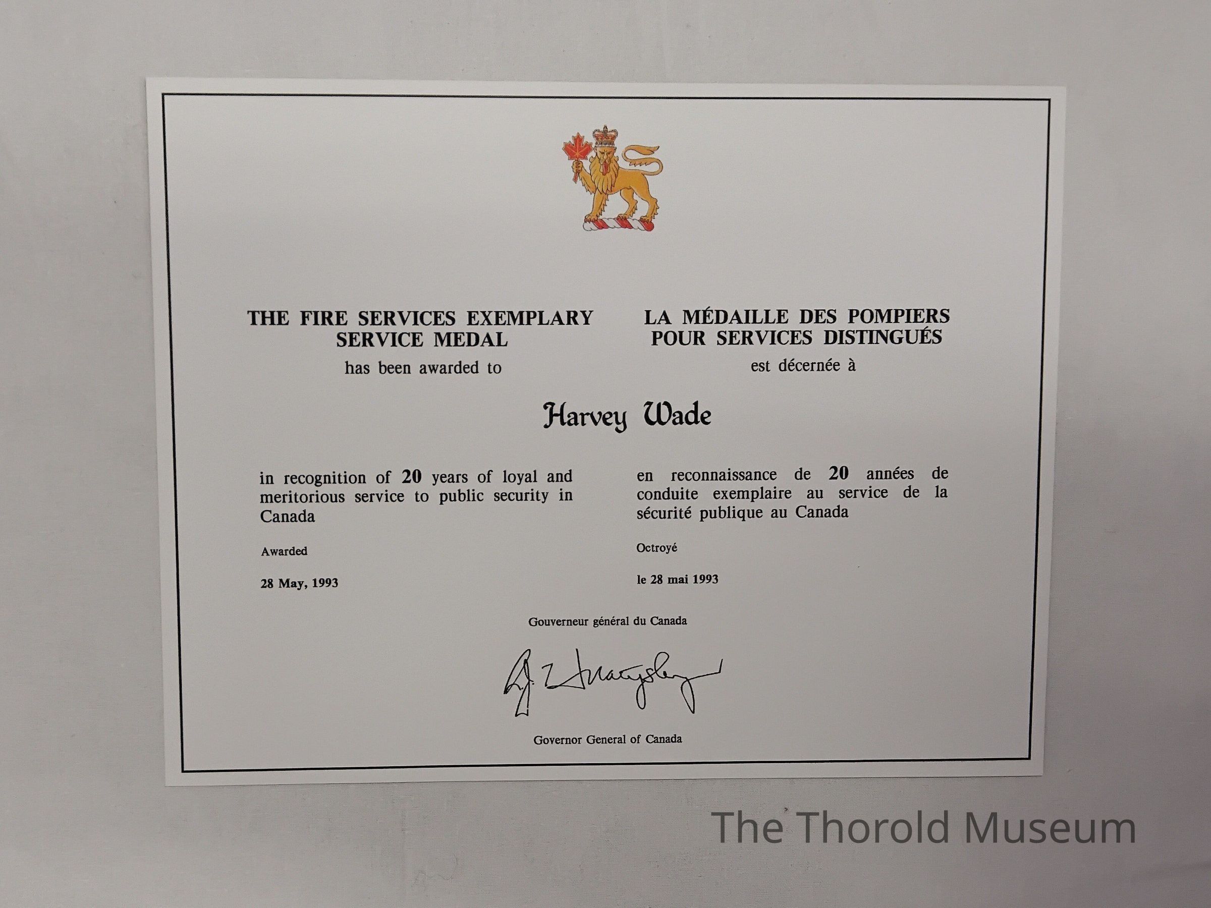 A large white envelope from Rideau Hall. Inside is a folded cardboard sleeve, protecting a certificate for The Fire Service Exemplary Service medal.Dimensions