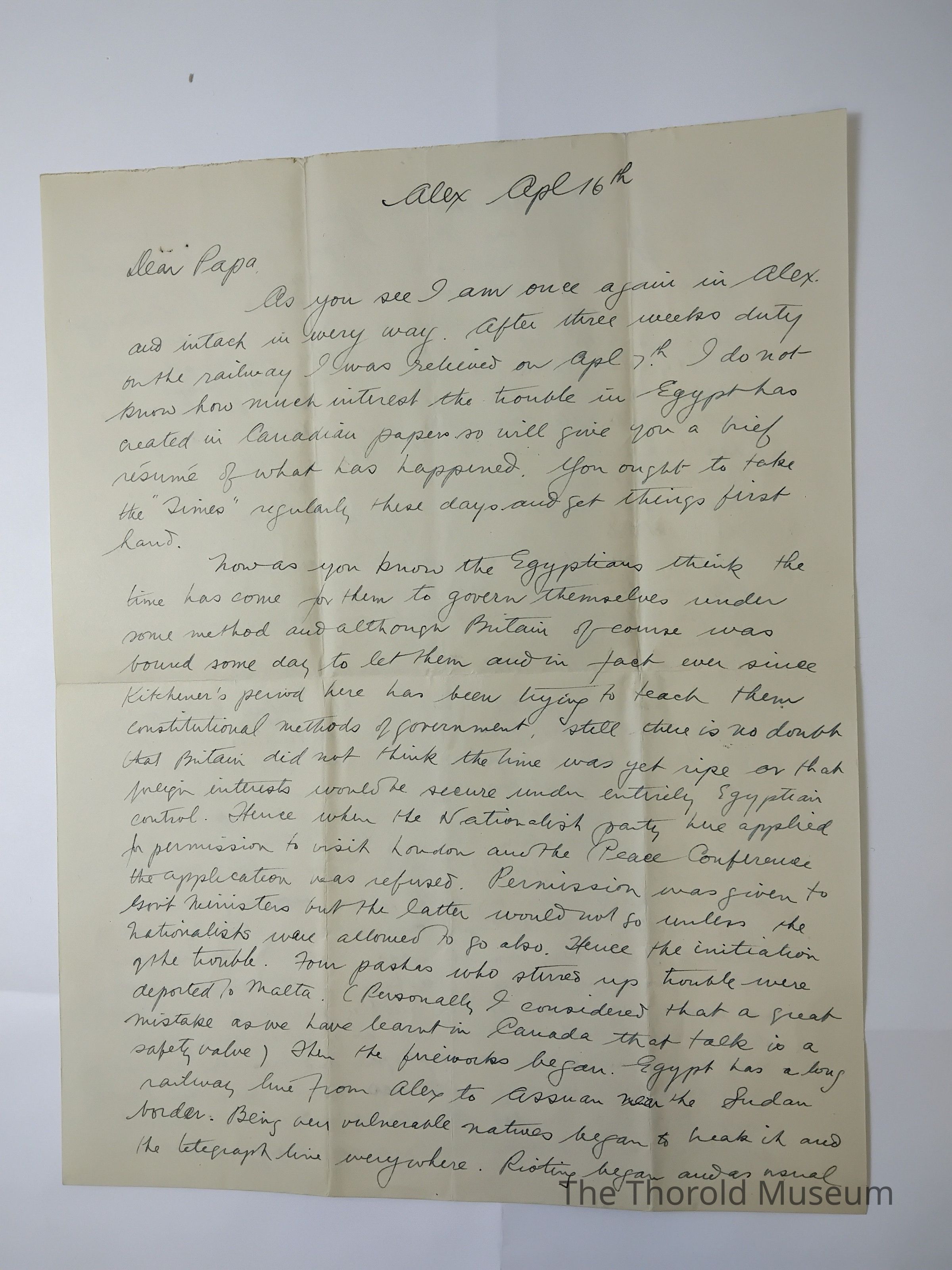 Now as you know the Eggptions think the time has come for them to govern themselves under some method, and although Britain of course was bound some day to let them, and in fear ever since Kitchener's period here has been trying to teach them constitutional methods of government, still there is no doubt that Britain did not think the time was yet ripe, or that forein interests would be servere under entirely Eggption control. Hence when the Nationalist party here applied for permission to [????] London and the Peace Conference the application was returned. Permission was given to first nationalists but the latter would not go [??????] The nationalists were allowed to go also. Hence the initiation of the trouble. From pa[???] Who [??????] up trouble were deported to Malta (personally I conaid[????] That a great mistake as we have learnt in Canada that talk is a safety value) then the fireworks began. Eggpt has a long railway here from Alex to Assuam near the [??????] London. Being [????] vulnerable natures began to break It and the telegraph line everywhere. Roiting begun and as usual the niff-naff joined it and began looting and even murdering Europeans. Hence troops were sent everywhere along the line, detachments being posted at [???????] A[?] places and the whole line was patrollers. As this stopped [...???...] On the whole little damage was done to our troops. [??] The [??????] The troops often were forced to fire as a last [?????] And considerable casualties were inflected. Nothing really has happened since the 11th, [???????] Took hold as high commissioner and at once released the four pasha's at Malta and allowed them to proceed to Europe. [?????] [??????] the gratitude and [???] Of the people and for three days following my relief they paraded demonstrating [??] Their thousands. During this period of demonstrating all troops except necessary guards and patrols were confined to camp. Everything is quiet now. Patience, [???????????] And reason will settle the question of Eggpt amicably.