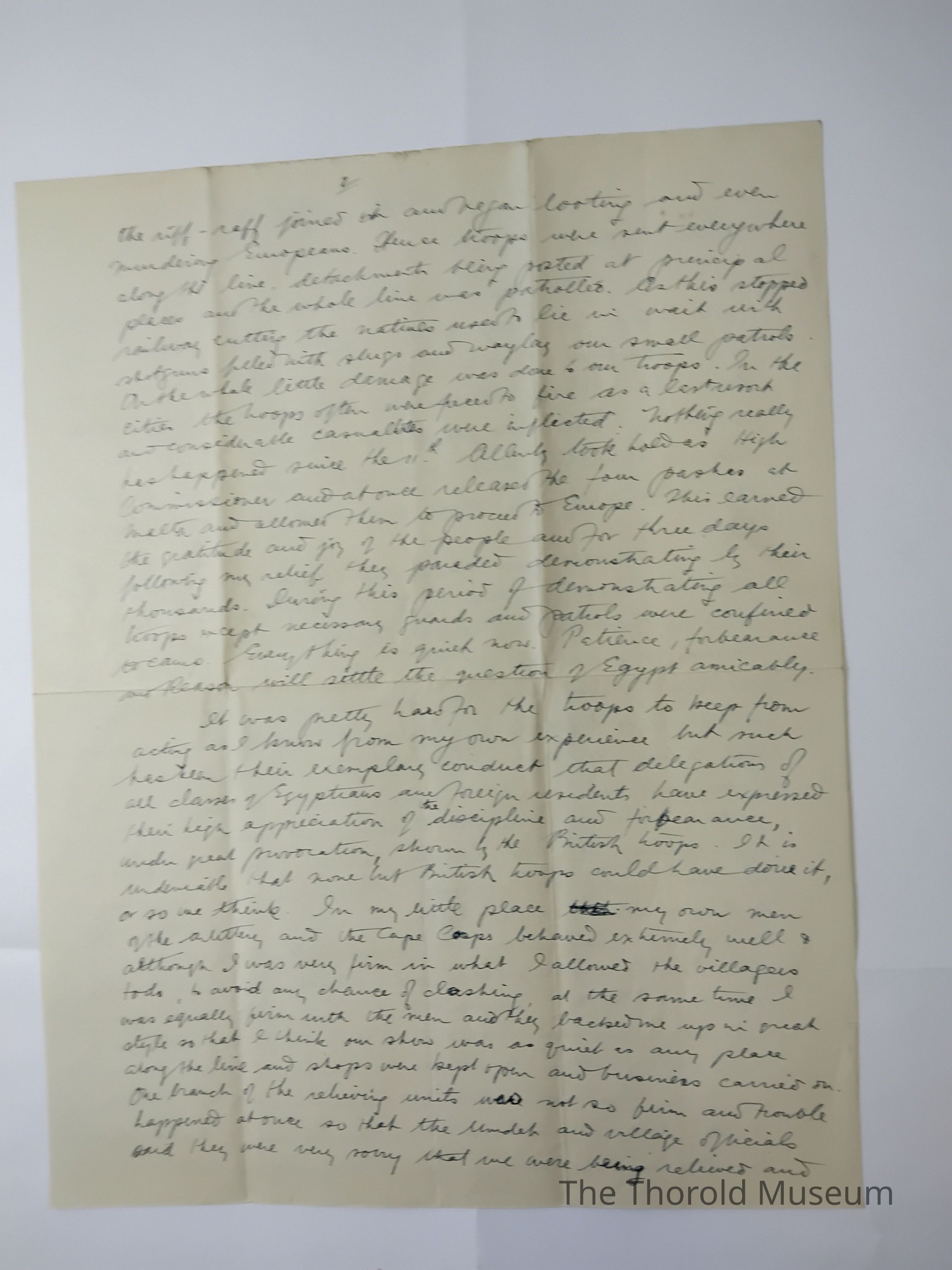 In my little place my own men of the artillery and the cape Corps behaved extremely well & although I was very firm in what I allowed the villagers to do, to avoid any chance of clashing, at the same time I was equally [?????] with the men and they looked me up in great style so that I think our show was as quiet as any place along the line and shops were kept open and business carried on. One branch of the reliving units was not so firm and trouble happened at once so that the [??????] And village officials [????] They were very sorry that we were being relived and did not feel so secure. So all together it was an experience not only pleasent in that i made great friends and had a comfortable "homey" [?????], but helpful in an instructive sense and I am quite glad it fell upon me. I quite believe the entire misunderstanding will be cleaned upto the satisfaction of Britain as well as Eggpt for Britain's oldtime [???????????] And [???????] Is again her chief method of solution. Eggpt is getting back to into ancient knowledge and prominence and no one grudges her antonomy if she proves she can protect foreign residents, that is the keystone.