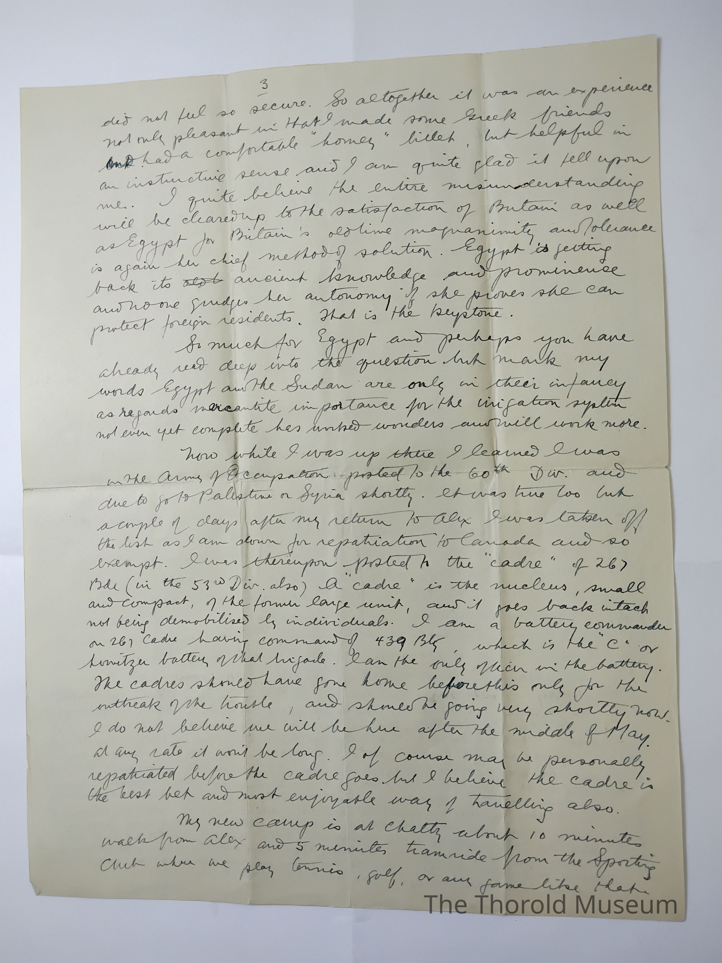 As you see I am once again in Alex, and intack in every way. After three weeks duty on the railway I was relieved on Apr 7th, I do not know how much interest the trouble in Eggpt has created in Canadain papers, so I will give you a brief resume of what has happened. You ought to take the ''[?????]" Regularly these days and get things first hand.