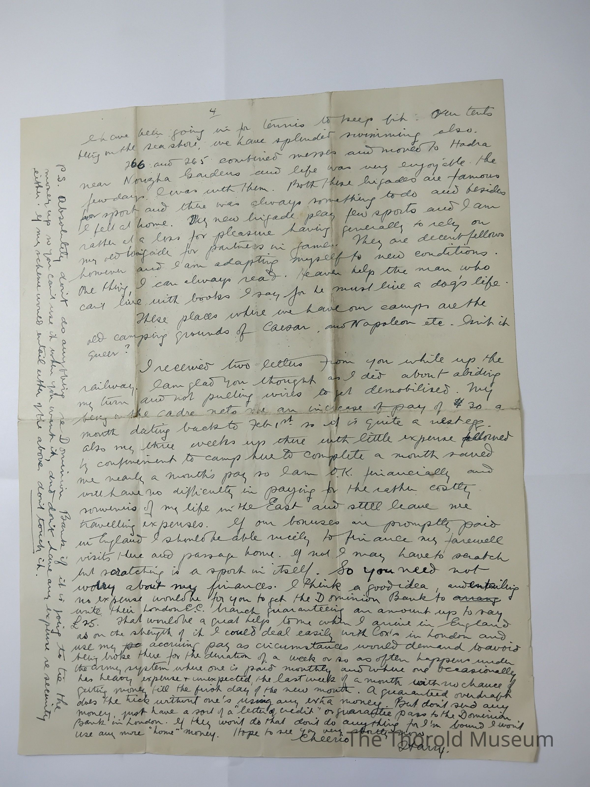 I received two letters from you while up the railway. I am glad you thought as I did about [????????] My train and not pulling wines to get demolished. My [???...????] An increase of pay of $30 a month dating back to Feb 1st so it is quite a [????????.] Also my three weeks up there with little expense followed by confinement to camp here to complete a month served [???] Nearly a month's pay so I am O.K. finanically and will have no difficulty in paying for the rather costly [?????????] Of my life in the East and still leave me travelling expenses. If our [????????] Are promptly paid in England I should be able nicely to finance my farewell units there and perhaps home. If not I may have to scratch but cratching is a sport in [??????]. So you need not worry about my finances. I think a good idea, and entailing no expense would be for you to get the Dominion back to unite their London E.C branch guaranteeing an amount up to say 25 euros. That would be a equal help to me when I arrive in England as on the strength of it I could deal easily with Cox's in London and use my accuming pay as cirumstation would demand to avoid being broke there for the deration of a week or so as often happens under the army system where one is paid monthly and where one occasionally has heavy expense + unexpected, the last week of a month with no chance of getting money till the first day of the new month. A guaranteed overdraft does the trick without one's earning any extra money. But don't send any money, just have a lot of a "letter of [??????]" Or guarantie pays to the Dominion Bank in London. If they wont do that don't do anything for I'm bound I wont use any "home" money. I hope to see you very shortly now,