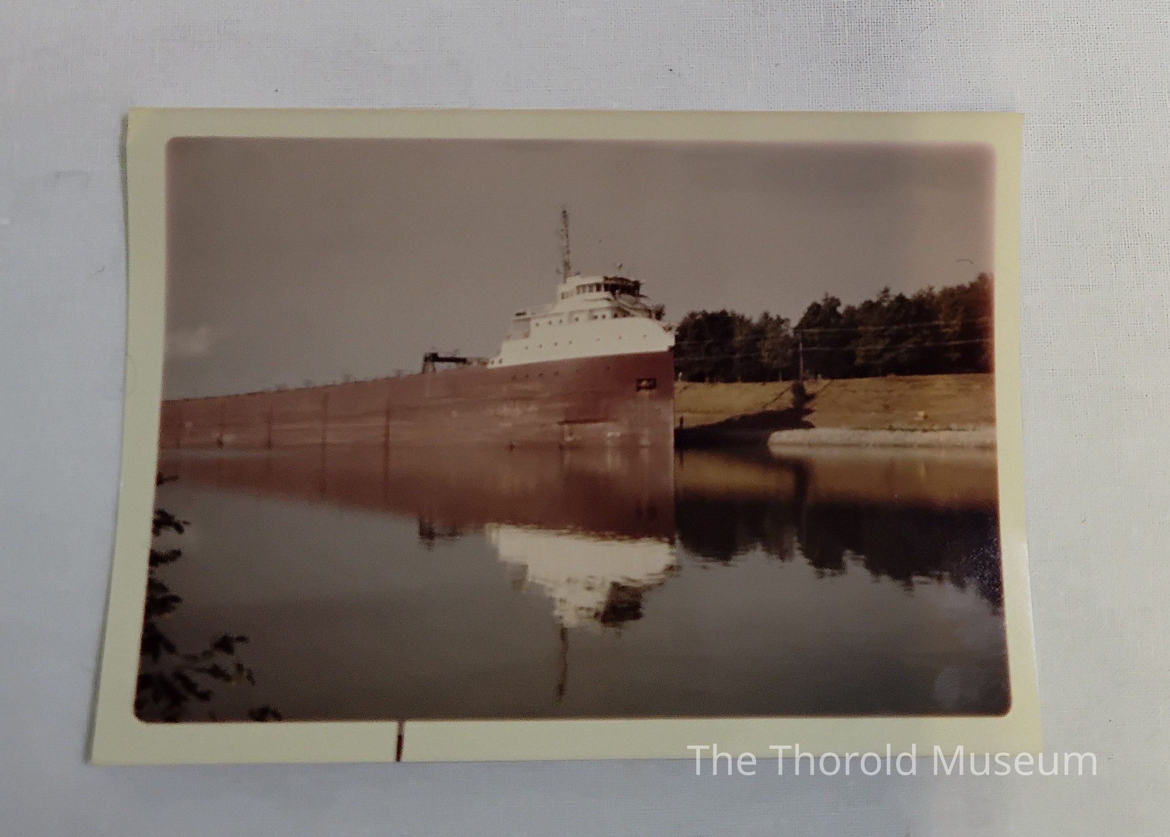 An old photo of a large ship passing through the Welland Canal.Photograph Details