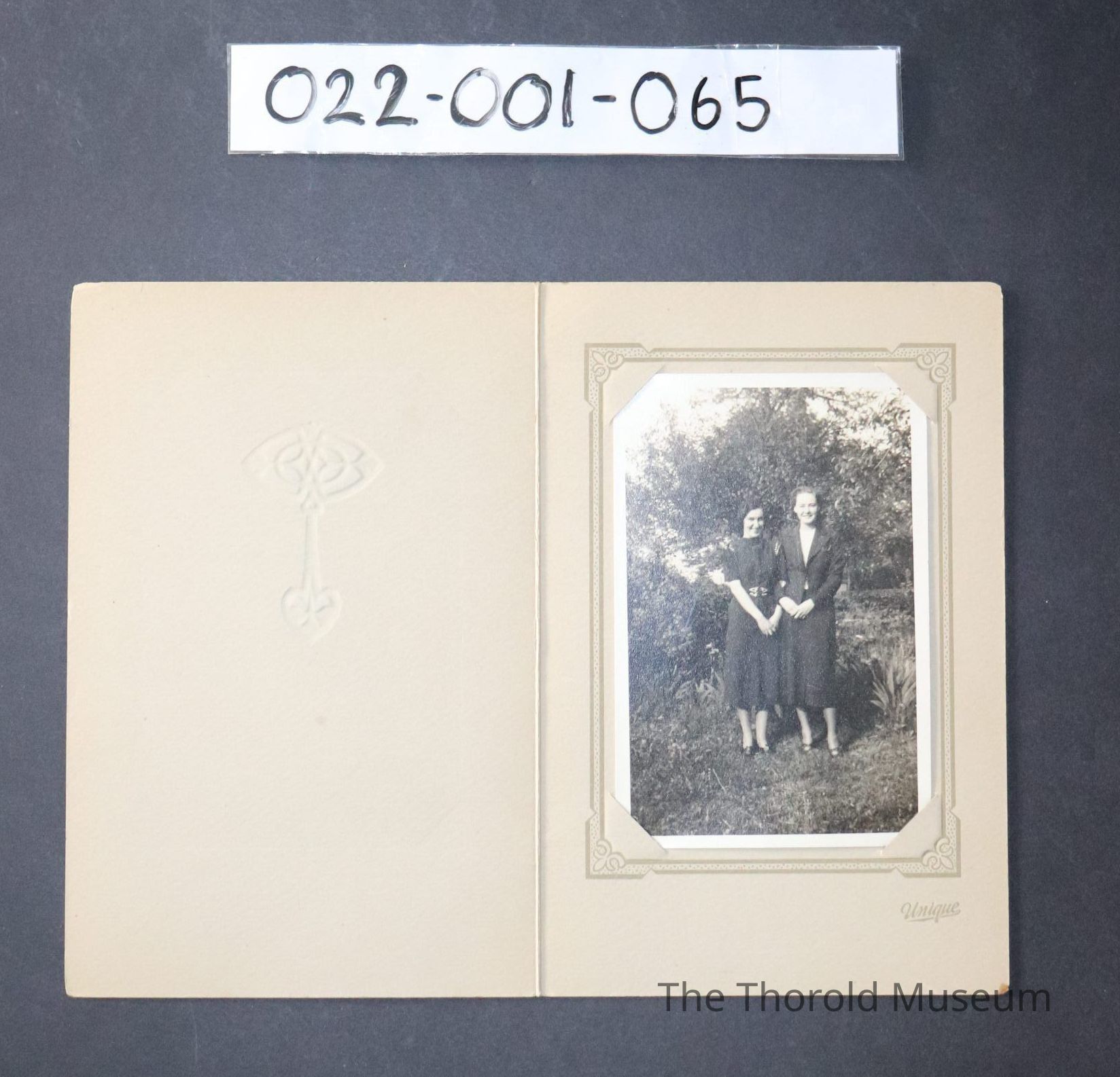 An old photo of Mabel Moss and one other person in a garden in light card paperPhotograph Details