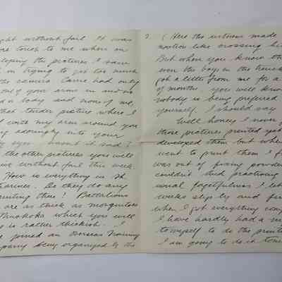 Well honey I never got those pictures printed yet. I developed them but when I went to print them I found I was out of fixing powder so couldn't. And practicing my usual forgetfulness I let the weeks slip by and finally when I got everything complete I have hardly had a night to myself to do the printing. but I am going to do it tomorrow night without fail. It was sore touch to me when on developing the pictures I saw that I'm trying to set too much in the camera, Carrie had only got one of your arms in and no head or body and none of me, in that tender picture where I stood with my arm around you gazing adoringly into your lovely eyes. wasn't it sad?