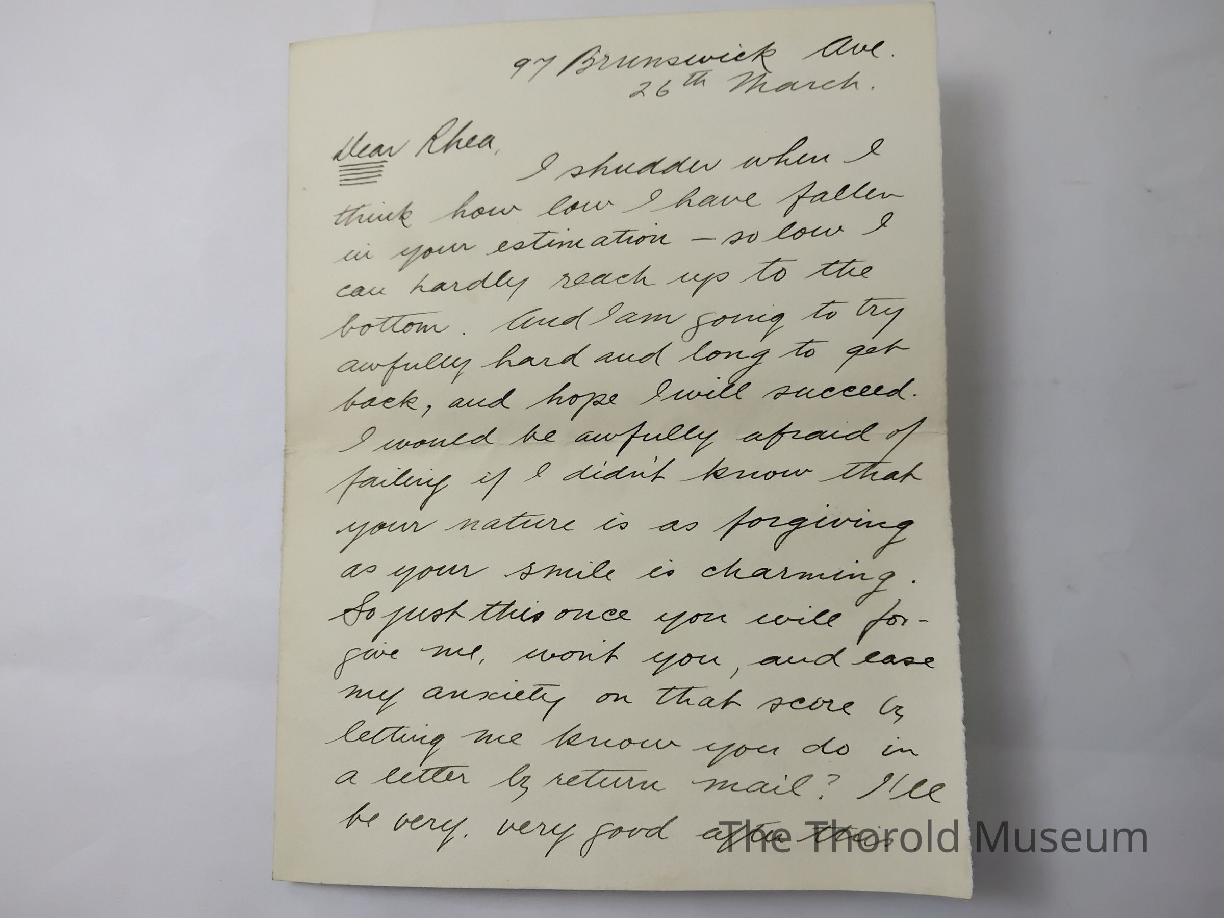 I shudder when I think how low I have fallen in your estimation - so low I can hardly reach up to the bottom. And I am going to try awfully hard and long to get back, and hope I will succeed. I would be awfully afraid of failing if I didn't know that your nature is as forgiving as your smile is charming. So just this once you will forgive me, won't you, and ease my anxiety on that sense by letting me know you do in a letter by return mail? I'll be very, very good after this. (here the writers made a motion like crossing his heart) but when you know that not even the boys in the trenches have got a letter from me for a couple of months, you will know that nobody is being preferred to yourself. I should say not!