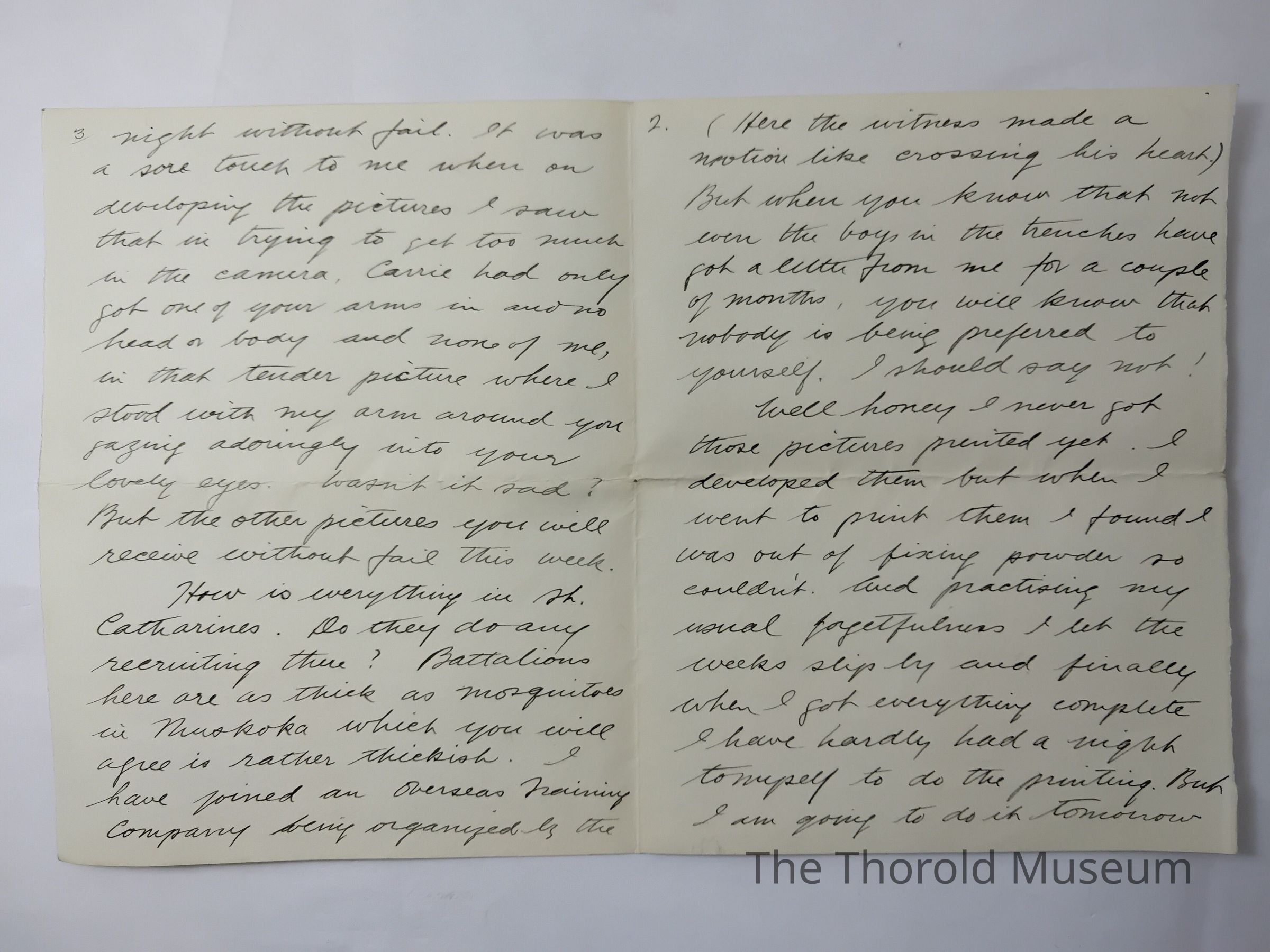 how is everything in St. Catharines. Do they do any recruiting there? Battalions here are as thick as mosquitoes in Muskoka which you will agree is rather thickish. I have joined an overseas training company being organized by the University and expect to receive word to report any day. In due course, (about the end of May) I hope to be a lieutenant (and perhaps later a general, but I am not a pig.)