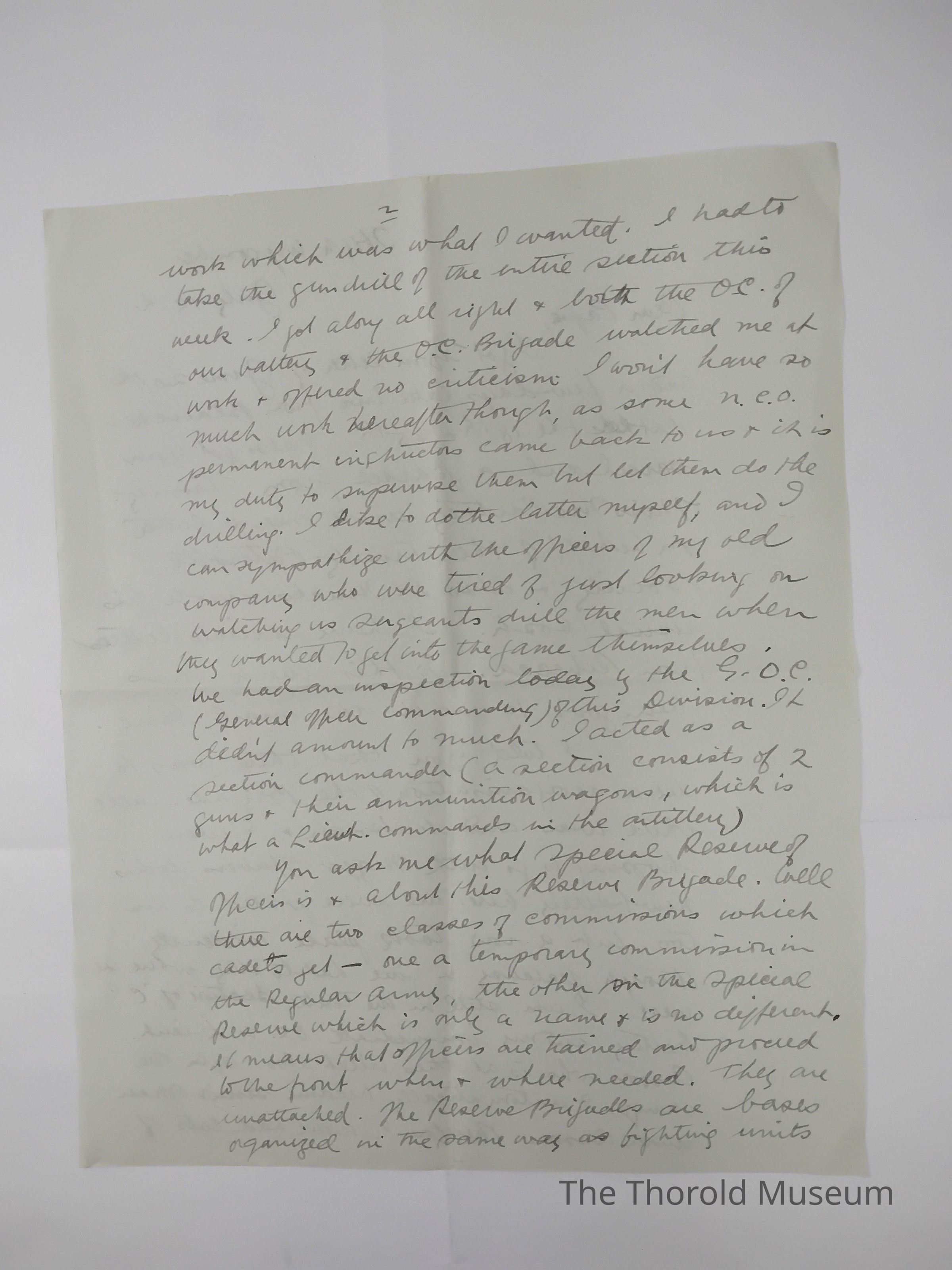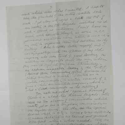 I told you that there was to be a [????????????] Of the Brigade, well there was and Kirkman & I were hoping to go with major Havens to his new battery here. We were posted to him too, but a vow took place evidently through jealousy * we had to stay where we were. I am still in the Centre Section of "C" battery and my immediate O.C. in Lieut. Auson who is at this billet also. After the changes I [?????] Actually become senior officer under Auson. Therefore I have had lots of work which was what I wanted. I had to take the gun drill of the entire section this week, I got along all right & both the O.C. of our battery & the O.C. Brigade watched me at work & offered no criticisms. I wont have so much work here after though, as some N.E.O. permanent instructions came back to us & it is my duty to suprise them but let them do the drilling. I like to the latter myself, and I can sympathize with the officers of my old company who ere tired of just looking on watching us sergeants drill the men when they wanted to get into the game themselves. We had an inspection today by the G.O.E. (General officer commanding) of this division. It didn't amount to much, I acted as a section commander (a section consists of 2 guns + their ammunition wagons, which is what a Lieut. commands in the artillery)