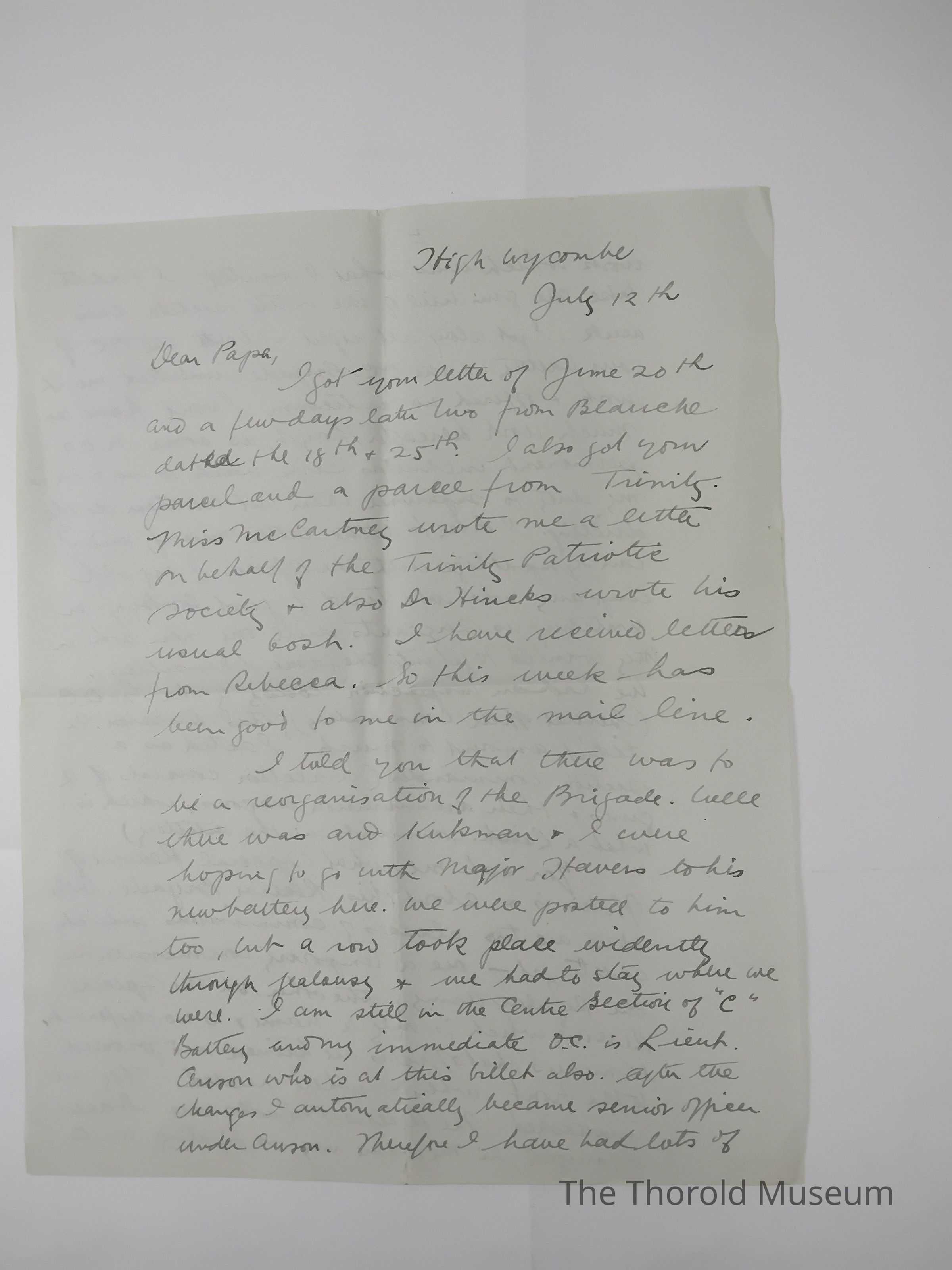 I got your letter of June 20th and a few days latter two from Blauche dated the 18th & 25th. I also got your parcel and a parcel from Trinity. Miss McCartney wrote me a letter on behalf of the Trinity Patriotic Society & also Dr. Hincks wrote his usual bosh. I have received letters from Rebecca. So this week has been good to me in the mail line.
