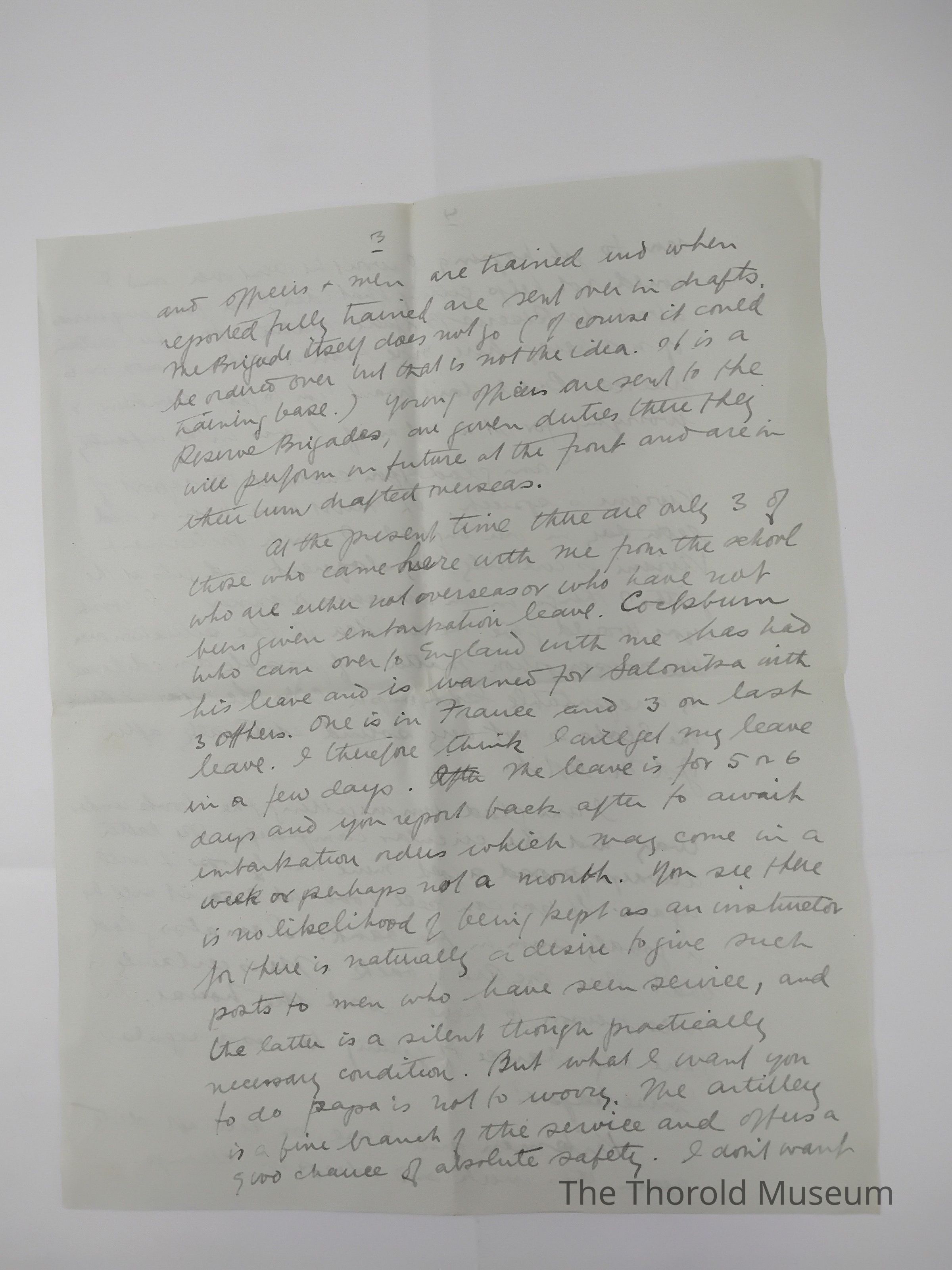 At the present time there are only 3 of those who came here with me from the school who are either not overseas or who have not been given [???????????] Leave. Cockburn who came here over to England with me has had his leave and is [?]arned for Salonika with 3 others. One is in France and 3 on last leave. I therefore think I will get my leave in a few days, the leave is for 5 or 6 days and you report back after to await [???????????] Orders which may come in a week or perhaps not a month. You see there is no likelihood of being kept as an instructor for there is naturally a desire to give such posts to men who have sent service, and the latter is a silent though practically necessary condition. But what I want you to do Papa is not to worry, the artillery is a fine branch of the service and offers a good chance of absolute safety. I don't want you to get hoping I won't be sent over and I could not help getting that idea from your inquiries about the Reserve Brigade matter, for I feel certain of not being here more than another month or 6 weeks. But I don't want you to get thinking & worrying for it is not as if I was in the infantry.