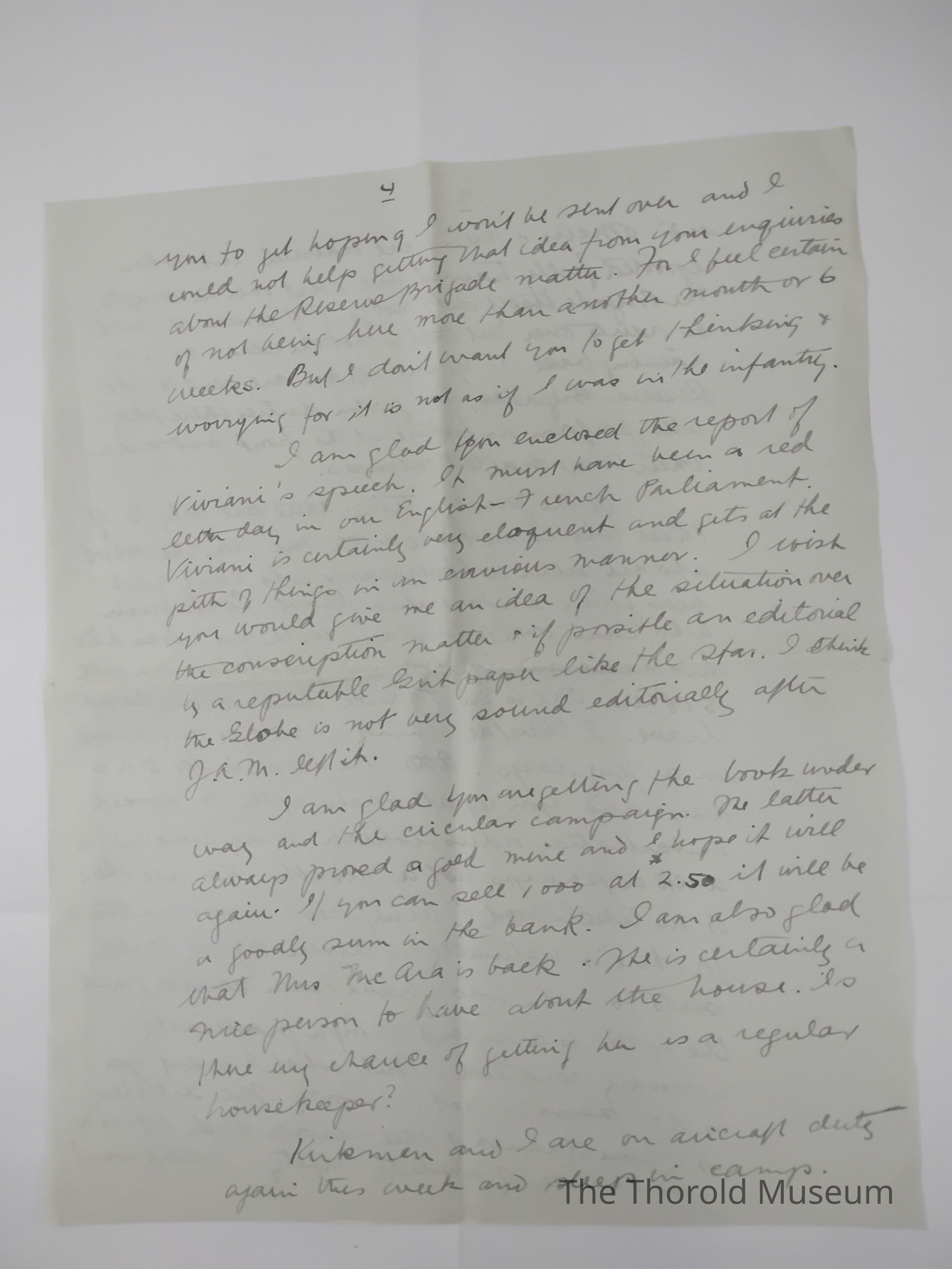 I am glad you enclosed the report of Vierani's speech, it must have been a red letter day in our English - French Parliament. Vierani is certainly very eloquent and gets at the pith of things in an curious manner. I wish you would give me an idea of the situation over the conscription matter + if possible an editional by a reputable Brit paper like The Star. I think The Globe is not very sound editorially after S.A.M. left it.