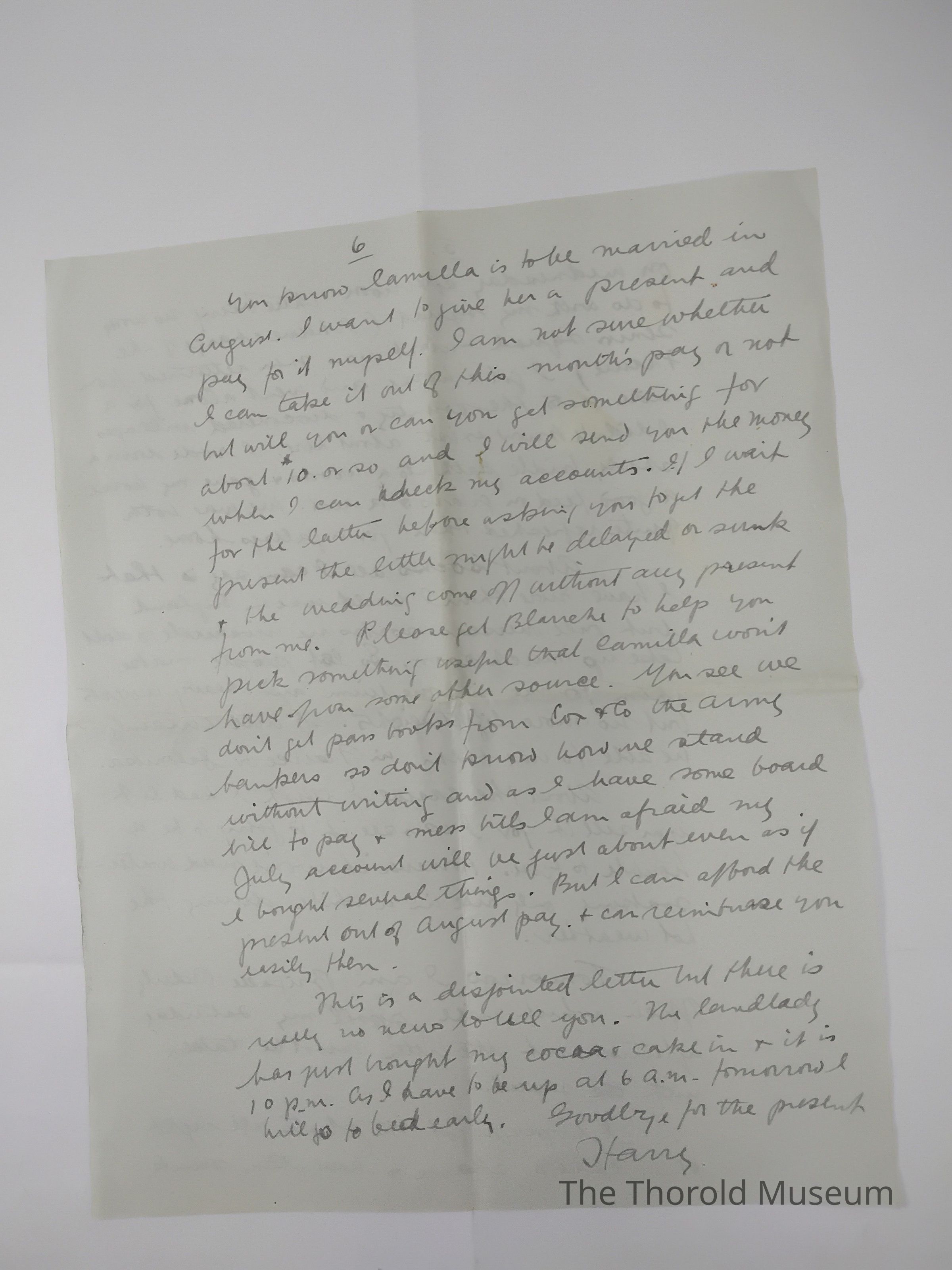 You know Camilla is to be married in August, I want to give her a present and pay for it myself. I am not sure whether I can take it out of this month's pay or not but will you or can you get something for about $10 or so and I will send you the money when I can [?????] My accounts. If I wait for the latter before asking you to get the resent the letter might be delayed or sunk + the wedding come off without any present from me. Please get Blauche to help you pick something useful that Camilla won't have from some other sources. You see we don't get pay books from the Cox & Co the army bankers so don't know how we stand without uniting and as I have some board bill to pay + mess bills I am afraid my July account will be just about even as if I bought several things. But I can afford the present out of August pay + can reimburse you easily then.