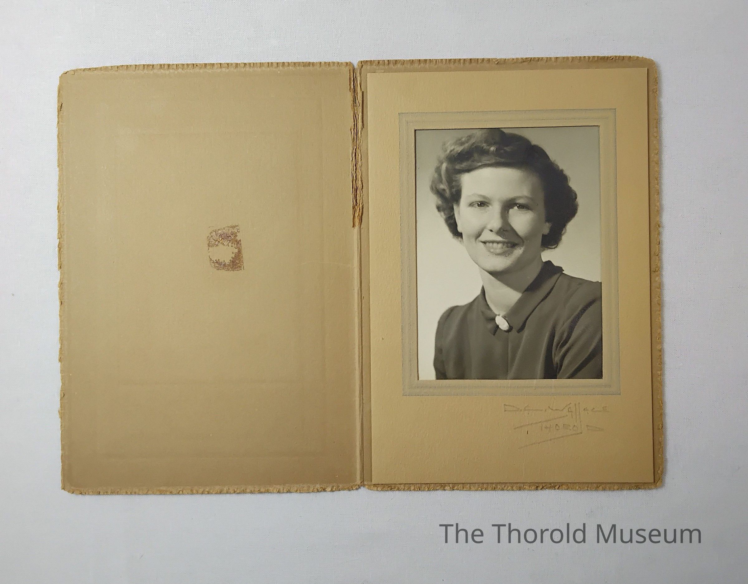 A photo in a protective sleeve of Mabel Moss as a young adult (possibly 20s to 30s). Writing underneath says D.C.Wallace, Thorold, name of photographer/company.Photograph Details