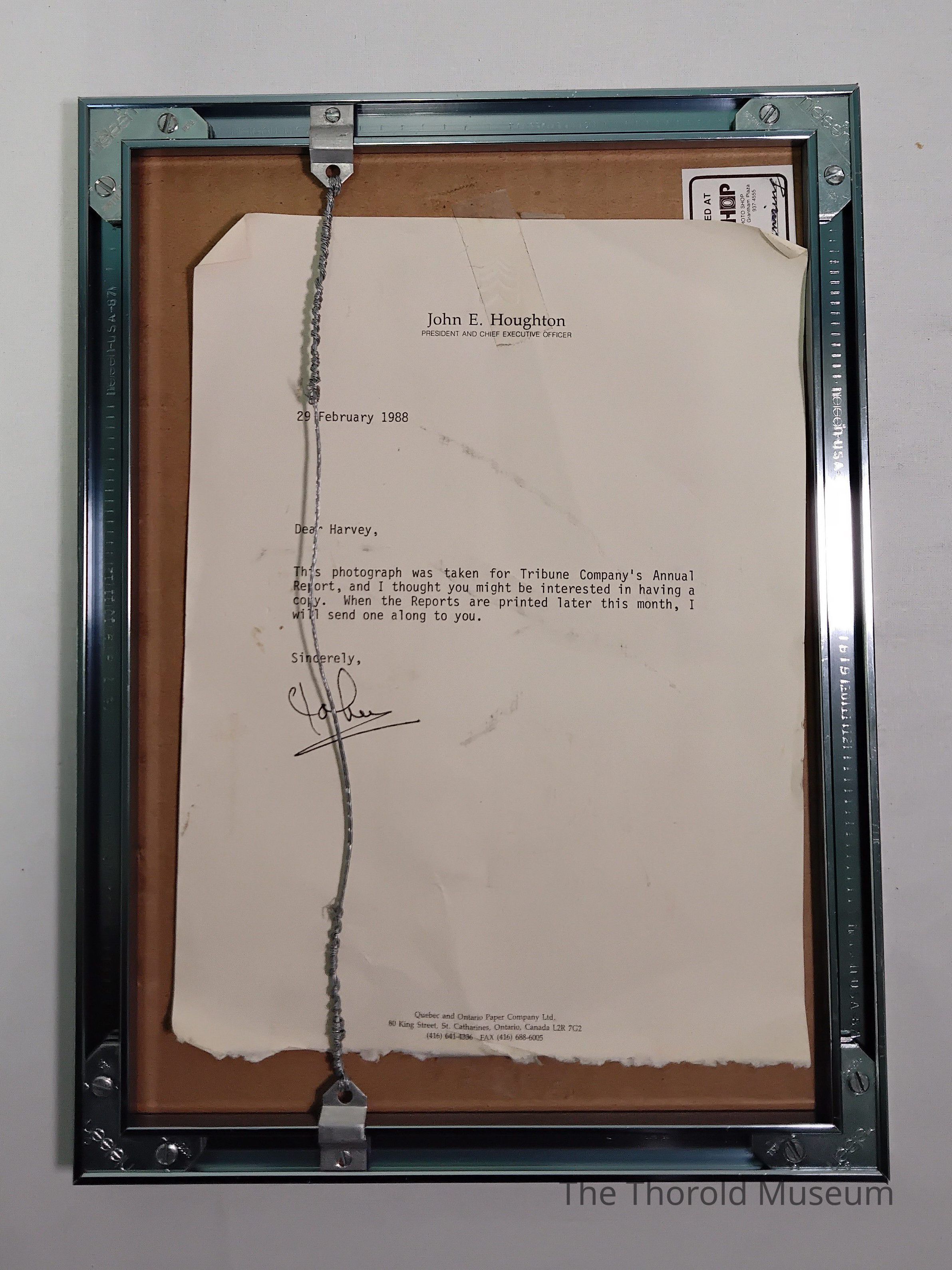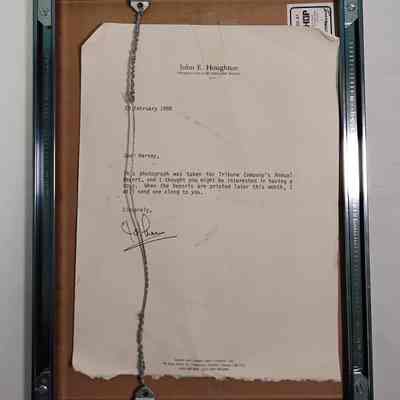A framed photo of Harvey Wade and various other people for Tribune Company's annual report. On the back is a letter from CEO John E. HoughtonCataloged By