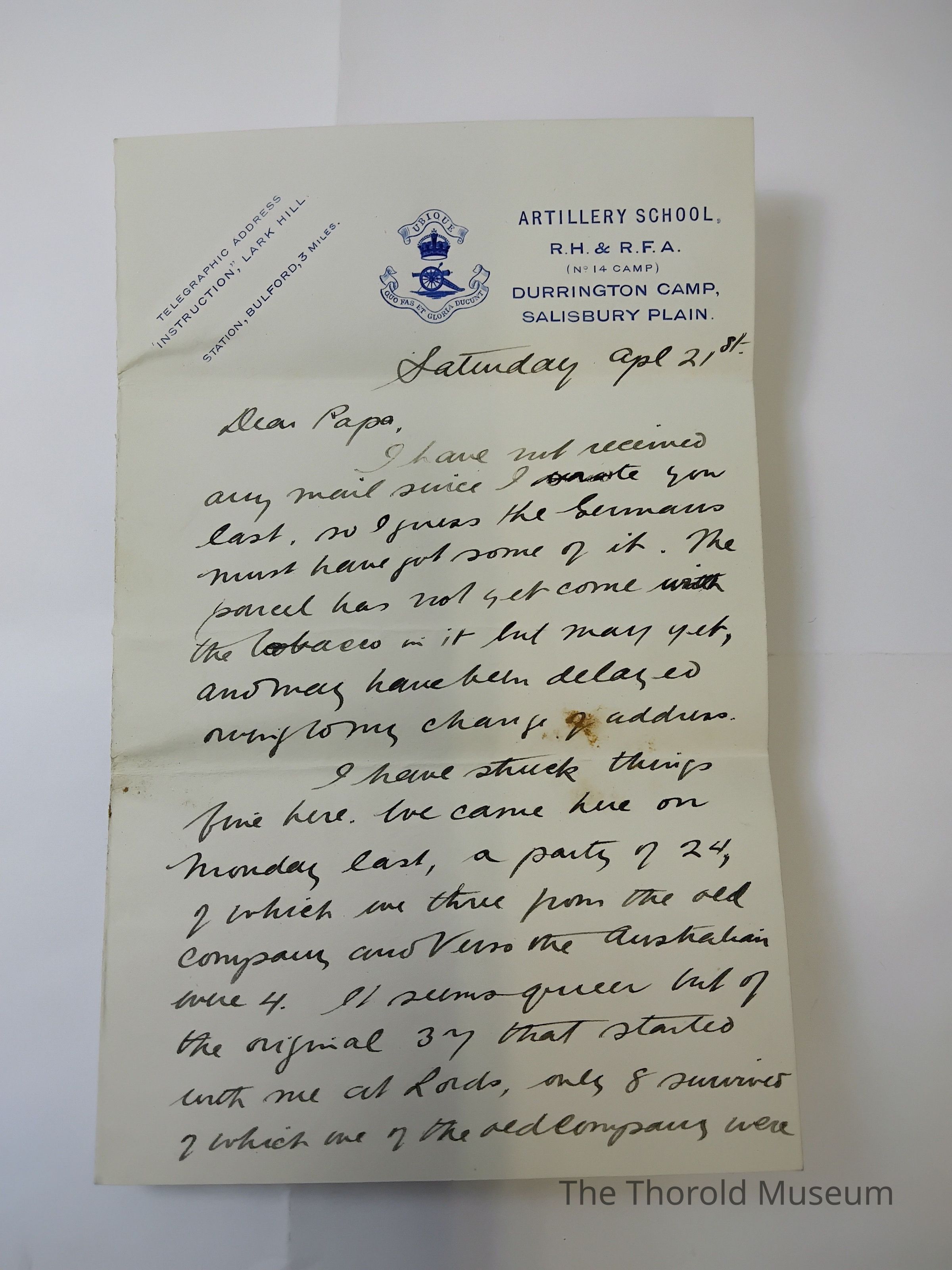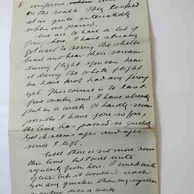 We are to(?) have a lot of [?] here. I have always got used to seeing the shells burst(?) and hear their scream during flight. [??] it during the whole flight. We have [?] had any firing yet. This [?] is to last [????], and I have already put in a week. [?] hardly seems [?] I have [????] the time has passed so quickly. Yet it seems ages and ages since I left.