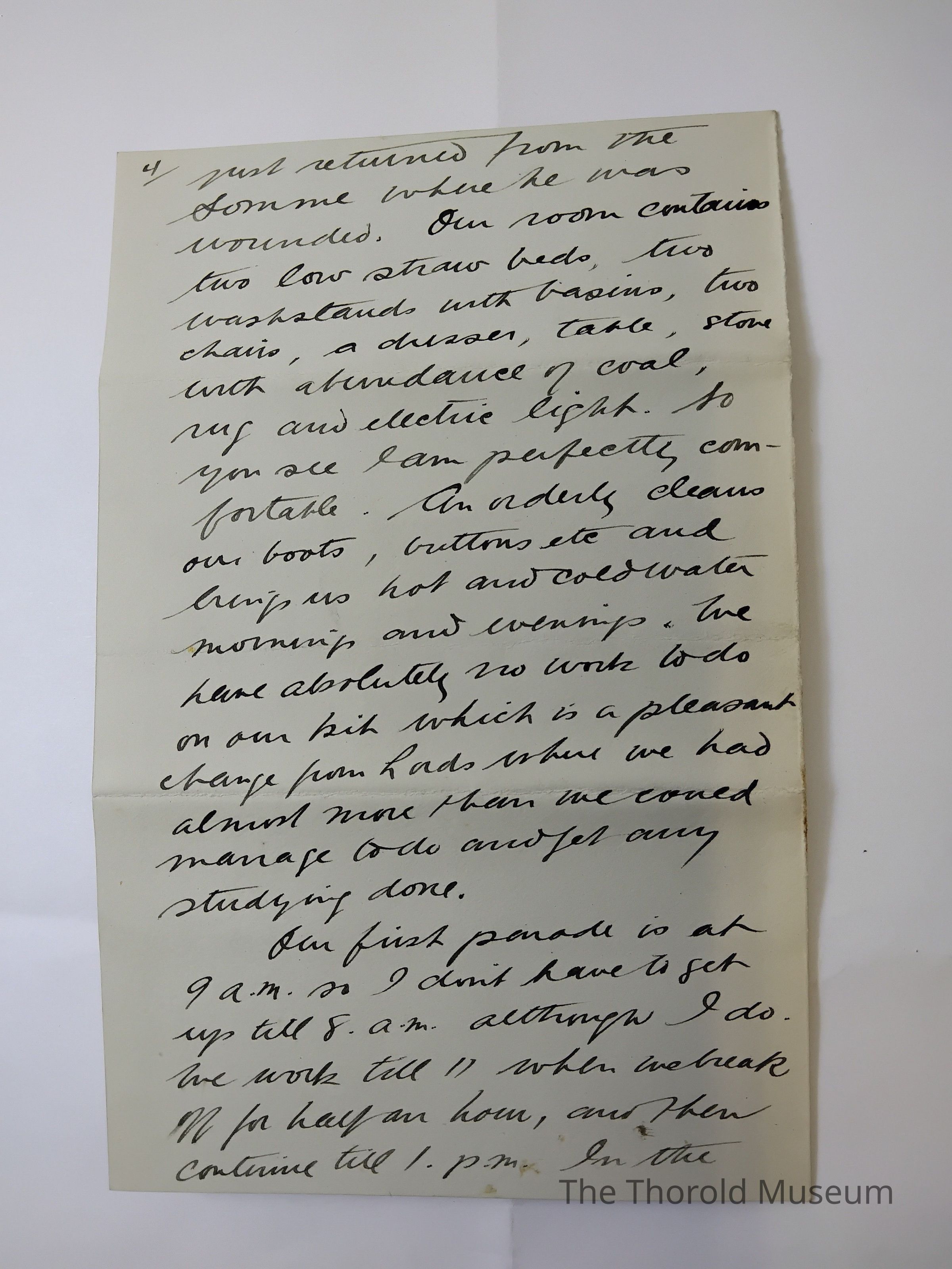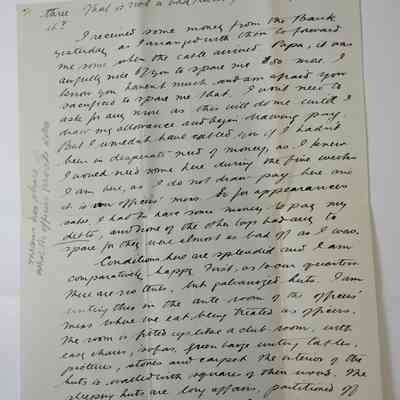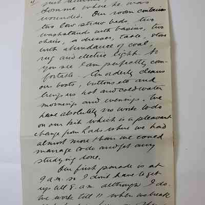 Conditions here are splendid and I am comparatively happy. First, as [?] our quarters. There are no [????]. I am writing this in the afternoon of the officers' [??] where we eat being treated as officers. The room is [?] up like a club-room, with[???????]. The sleeping huts are [?] officers, partitioned off into rooms for two or three. I live with a [???] named Kirkman(?), an awfully nice [??] returned from the [?]omme where he was [?]. Our room contains two low straw(?) beds, two [???], two chairs a [??????????????????] I am perfectly comfortable. [???] cleans our boots, buttons,[???]. we have absolutely no work to do [???] which is a pleasant(?) change from [??] where we had almost more that we could manage to do [?] get any studying done.