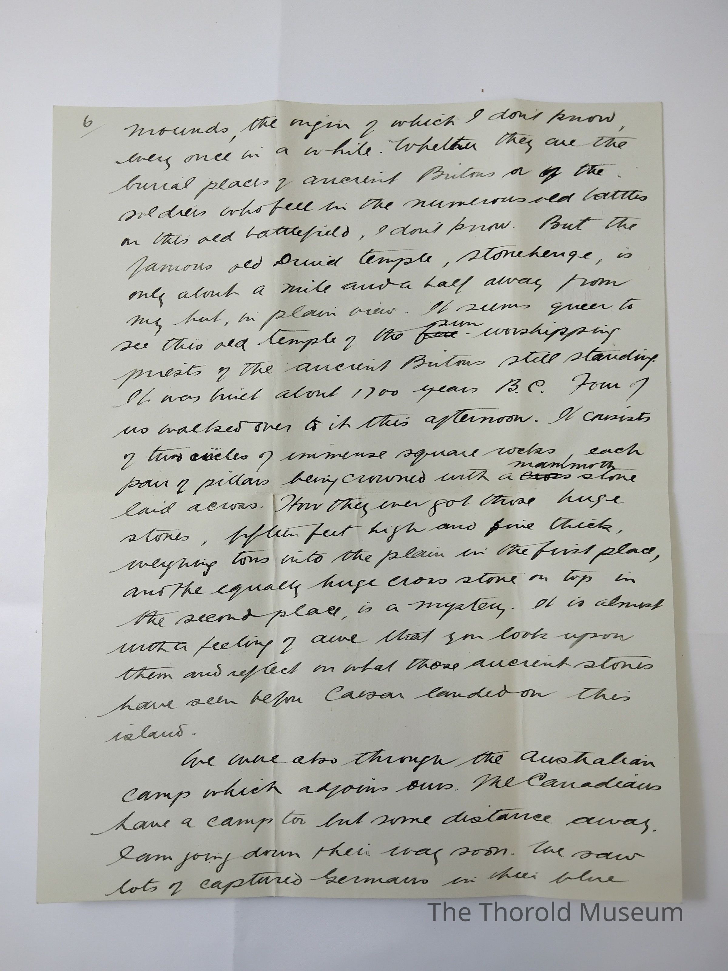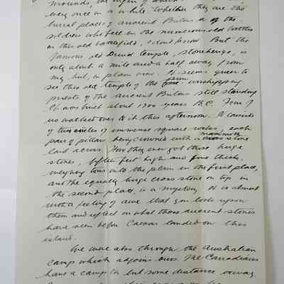 [??] plain(?) is a huge affair. You(?) [??????????], not like a plain(?) out west in Canada. There are [?], the [?] which I don't know, [?] once in a while. Whether they are the burial places of ancient Britain or of(?) the [??] the numerous [????] battlefield, I don't know. But the [????] is only about a mile and a half away from my [?], in plain view. [???????] worshiping the priests of the ancient Britain(?) still standing. It(?) was right about 1700 years B.C. [????] it this afternoon. [??????????] each pair of pillars being c[??]ed with a [?] laid across. How they ever(?) got those huge stones(?), [???] high and [?] thick [??] into the plain in(?) the burial(?) place, and the equally huge [?] stone on top in(?) the second place is a mystery. [?] is almost [?] feeling of [???] upon them and [????] what those ancient stones have [???] landed on this island.