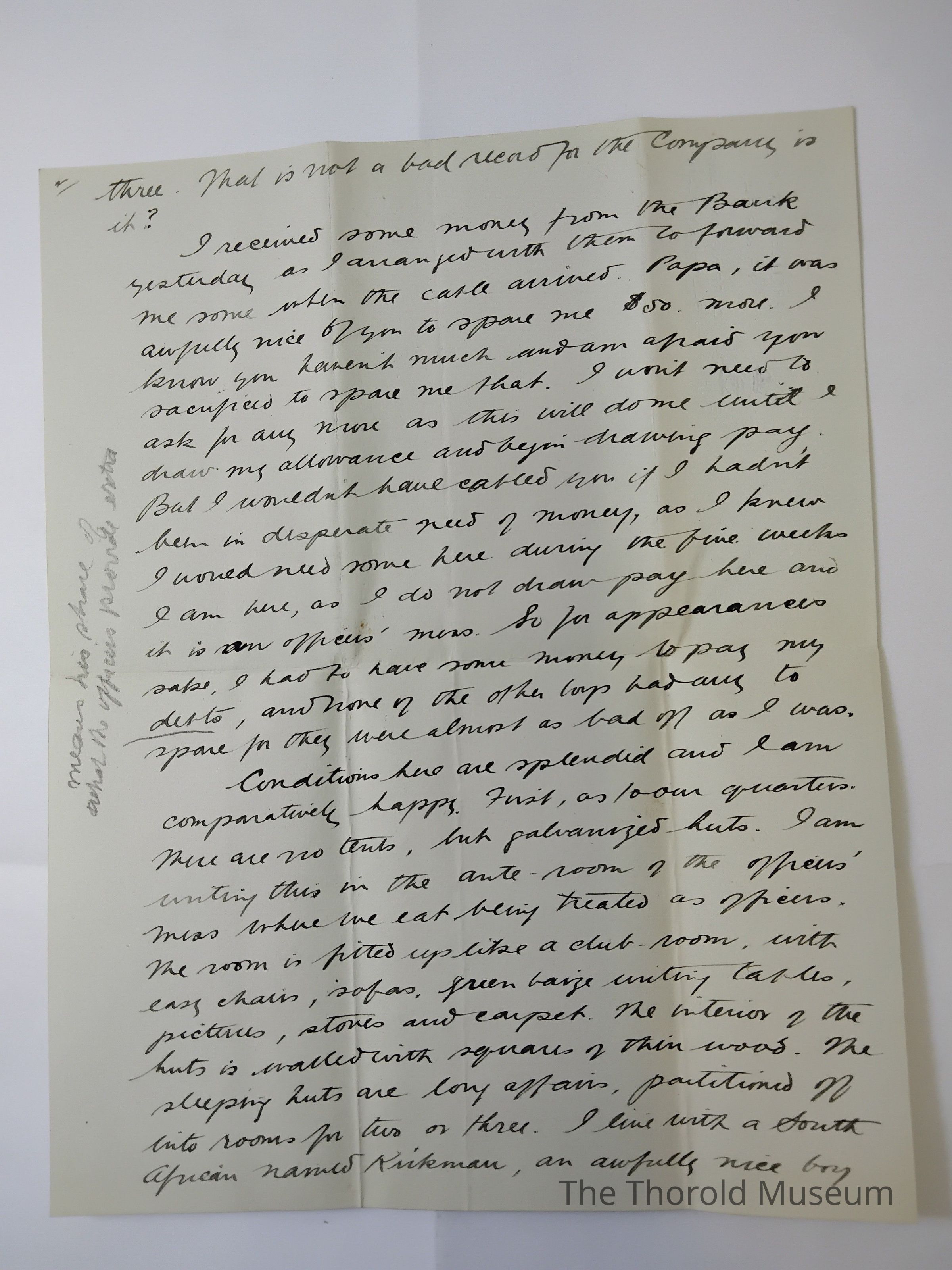 I received some money from the Bank yesterday as I [????????] me some when the [?] arrived. Papa, it was awfully nice of you(?) to spare me $50. [?]. I know you haven't much and am [?] you sacrificed to spare me that. I won't need to ask for(?) any more as this will do me [?] I draw my allowance and [????] pay. But I wouldn't have asked(?) you(?) if I hadn't been in desperate need of money, so I knew I would need some here during the five weeks I am here, as I do not draw pay here and it is [???]. So for appearances sake, I had to have some money to pay my debts, and [????] the other [?] had any to spare [???] as bad off as I was.