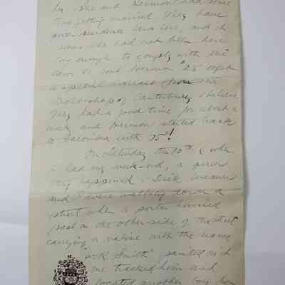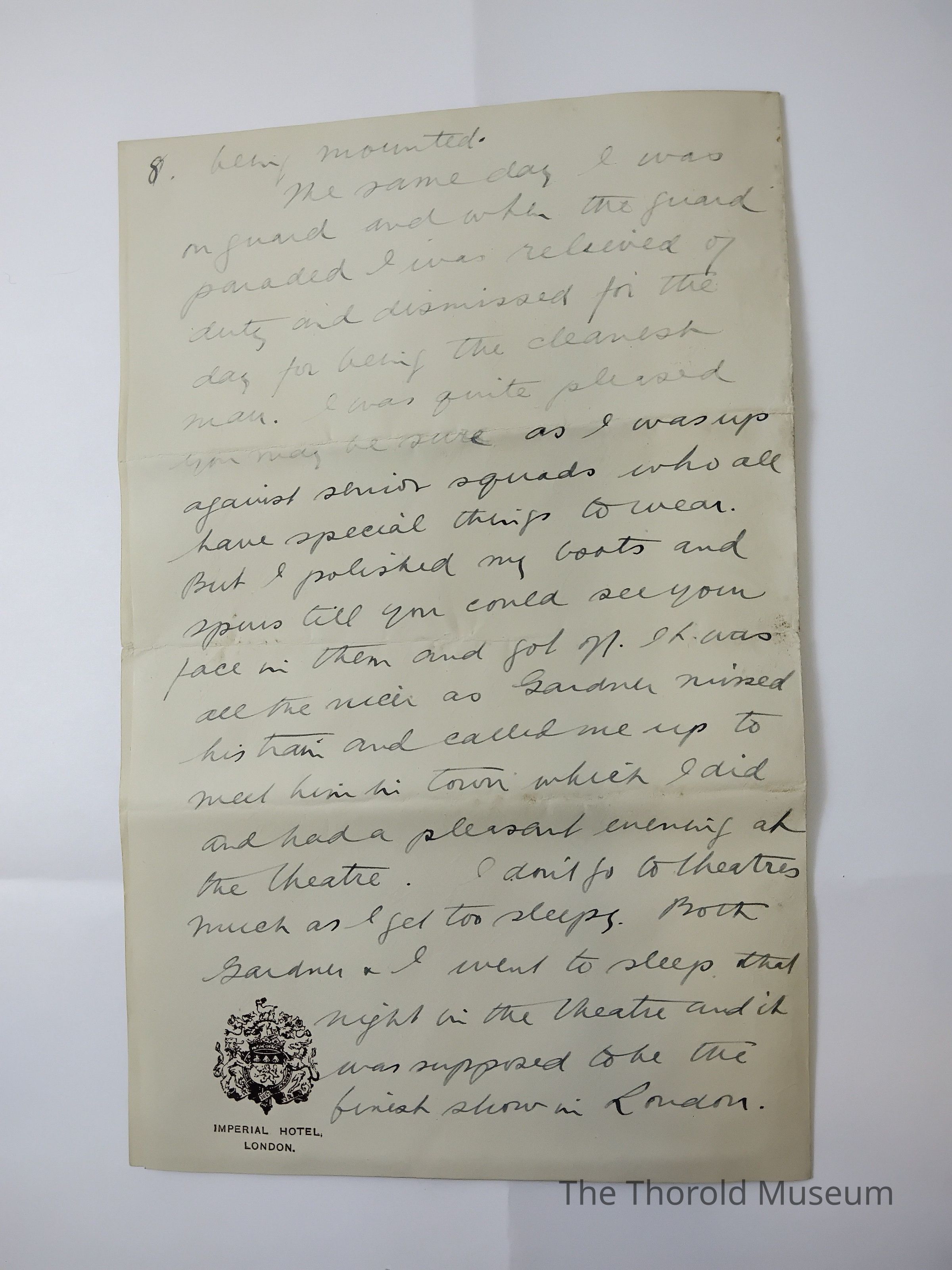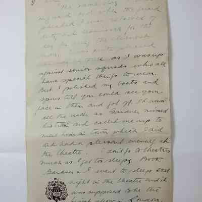 The same day I was on guard and when the guard paraded I was relieved of duty and dismissed for the day for being the cleanest man. I was quite pleased you may be [????] As I was up against [??????] Squads who all have special things to wear, but I polished my boots and [?????] Till you could see your face I them and got [???]. It was all the nicer as Sanduer [?????] His [????] And called me up to [?????] Him his [????] Which I did and had a pleasent evening at the theatre. I dont go to theatres much as I get too [?]leeps. Both Sanduer and I went to sleep that night in the theatre and it was supposed to be the [???????] Show in London.
