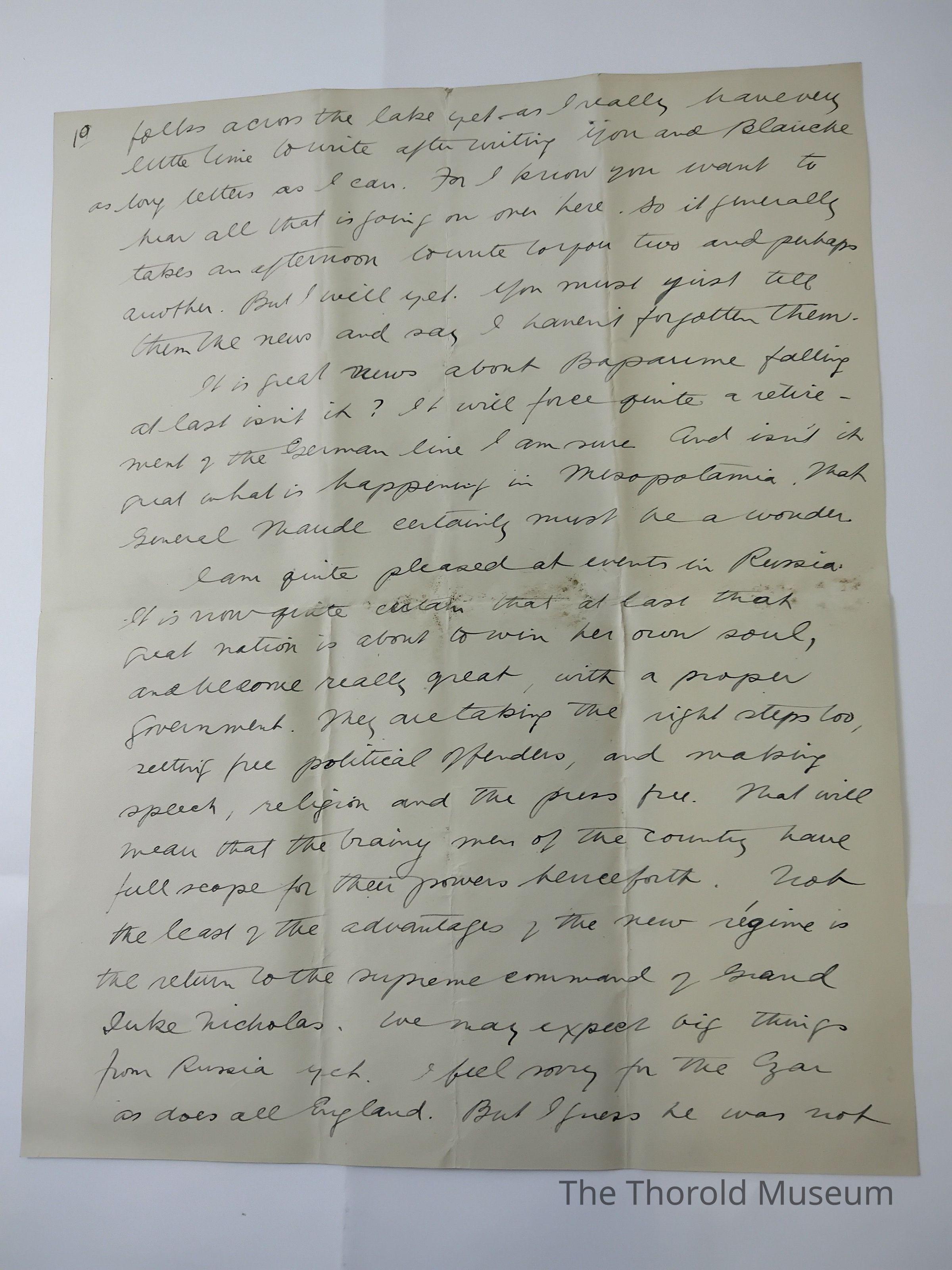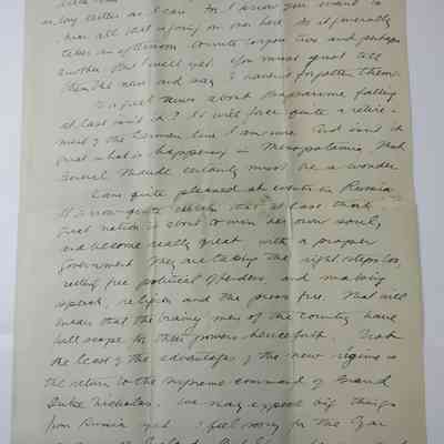 I am quite pleased at events in Russia, it is now quite certain that at last that [????] Nation is about to win her own soul, and become really great, with a proper government. They are taking the right steps too, setting free postictal offenders, and making speech, religion, and the press free. That will mean that the [???????] Then of the country have full scope for their power hence forth. Note the lead of the advantages of the new regime is the [???????] To the supreme [????????] Of squad [?????] [???????]. We may expect [???] things from Russia yet. I feel sorry for the [???] As does all England. But I guess he was not strung enough to cope with the old autocracy and PW Germanism particularly as he had a wife whom the Russian soldiers call "the German women"
