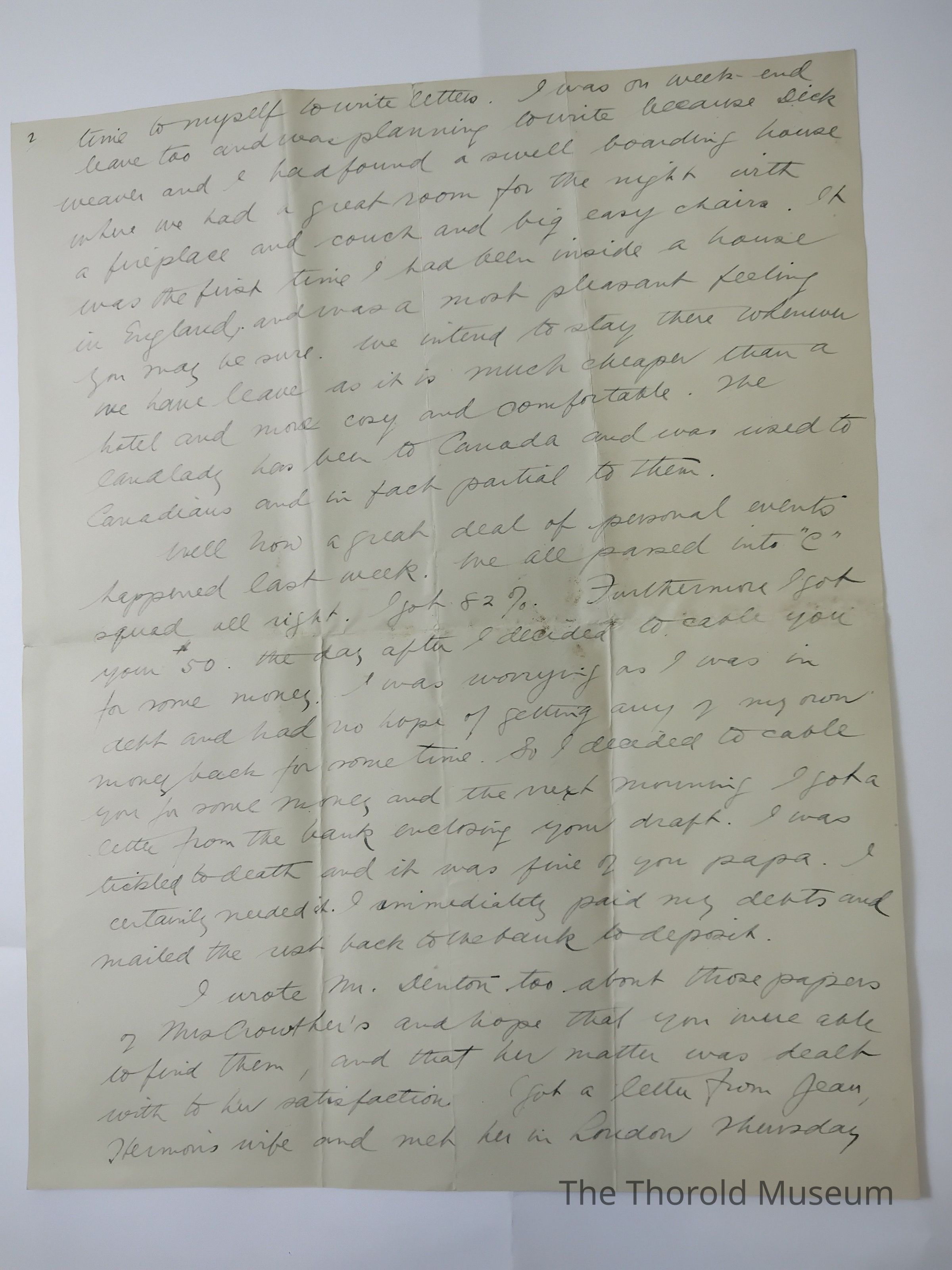 I was unable to write to you last week because I met eight of the boys from my old company who came down from Oxford on their way to the flying school, as you may well imagine we had quite a reunion because they were my best friends in the company. The usual was I didn't have s minutes time t myself to write letters. I was on weekend leave too and was planning to write because Dick Weaver and I had found a swell boarding house where we had a [????] Room for the night with a fireplace and couch and big [????] Chairs. It was the first time I had been inside a house in England, and was a much pleasent feeling as may be [????]. We intend to stay there whenever we have leave as it is much cheaper than a hotel and more cosy and comfortable. The [????]lady has been to Canada and was [????] To Canadians and [??] [????] Parial to them.