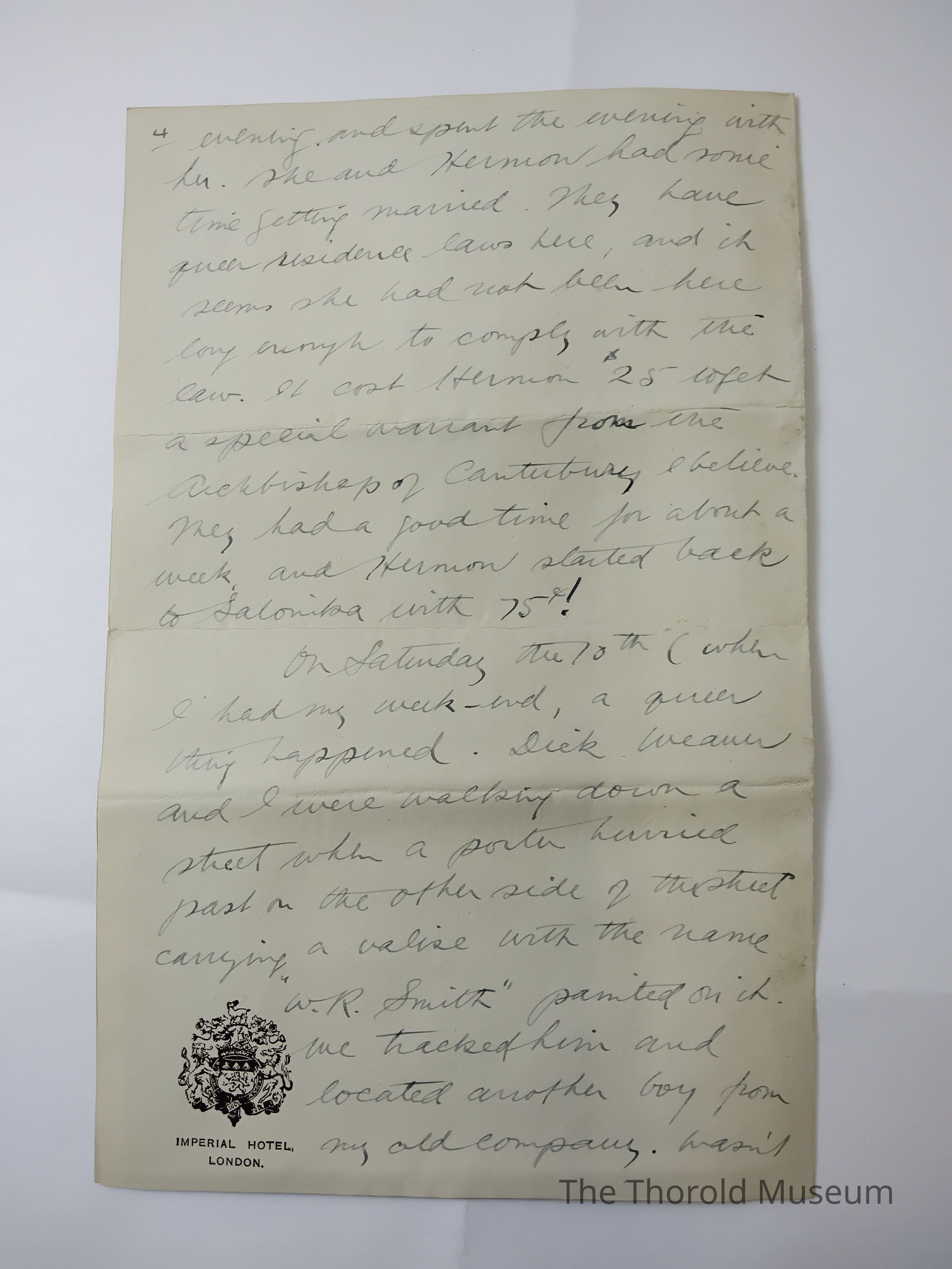 I wrote Mr.Denton too about those papers of Mis.Crowthens and hope that you were able to find them, and that her matter was dealt with to her satisfaction. I got a letter from Jean, Hermons wife, and met her in London Thursday evening and spent the evening with her. She and Hermon had some time getting maried. They have queen [??????????] Laws here, and it seems she had not been here long [?????] To comply with the law. It cost Hermon $25 to get a special [???????] From the [??????????] Of [??????????] I believe they had a [????[ Time for about a week and Hermon started back to Salonika with 75$!