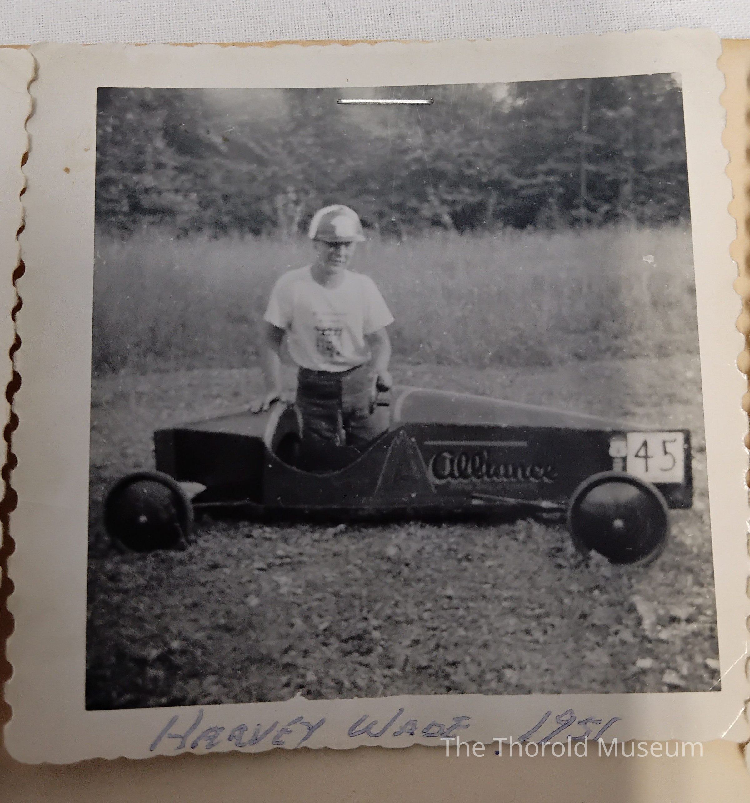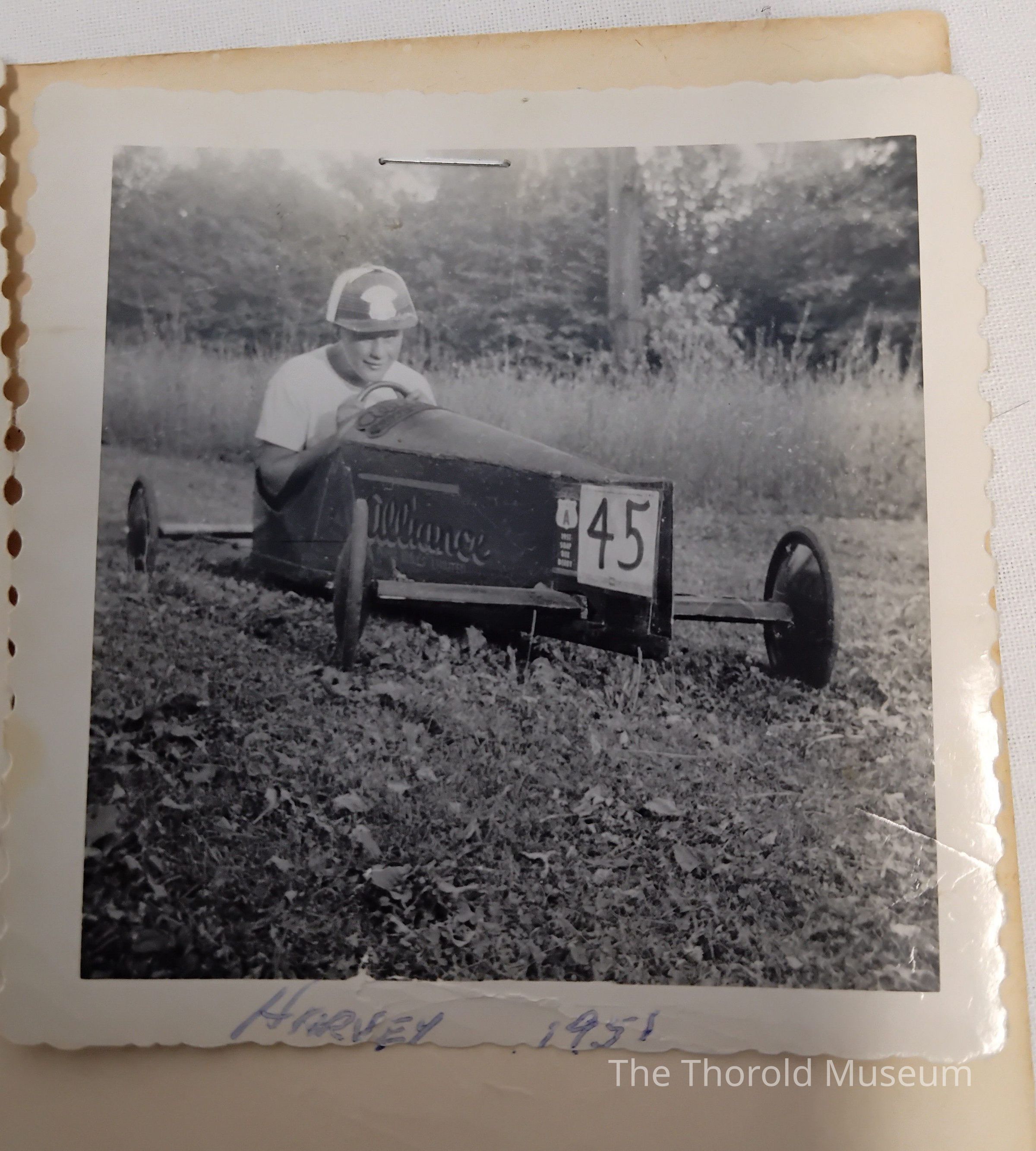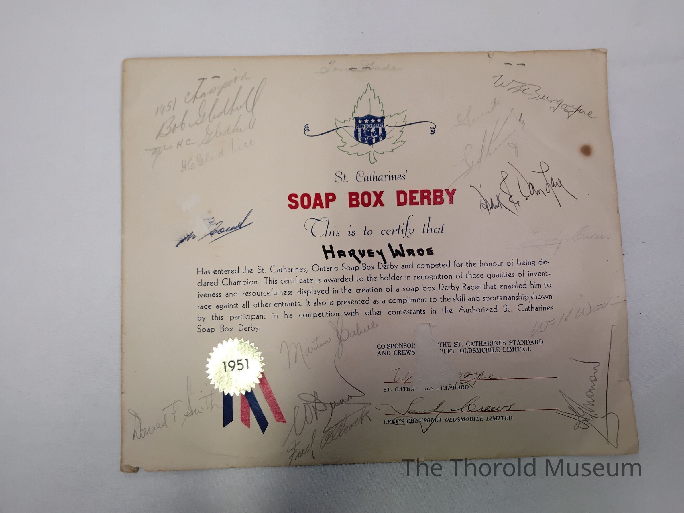 A 1951 Soap Box Derby Champion certificate, signed by many people, co-sponsor for the St Catharines Standard, and Crew's Chevrolet Oldsmobile Limited. On the back are three photos stapled to the certificate.Inscription/Signature/Marks