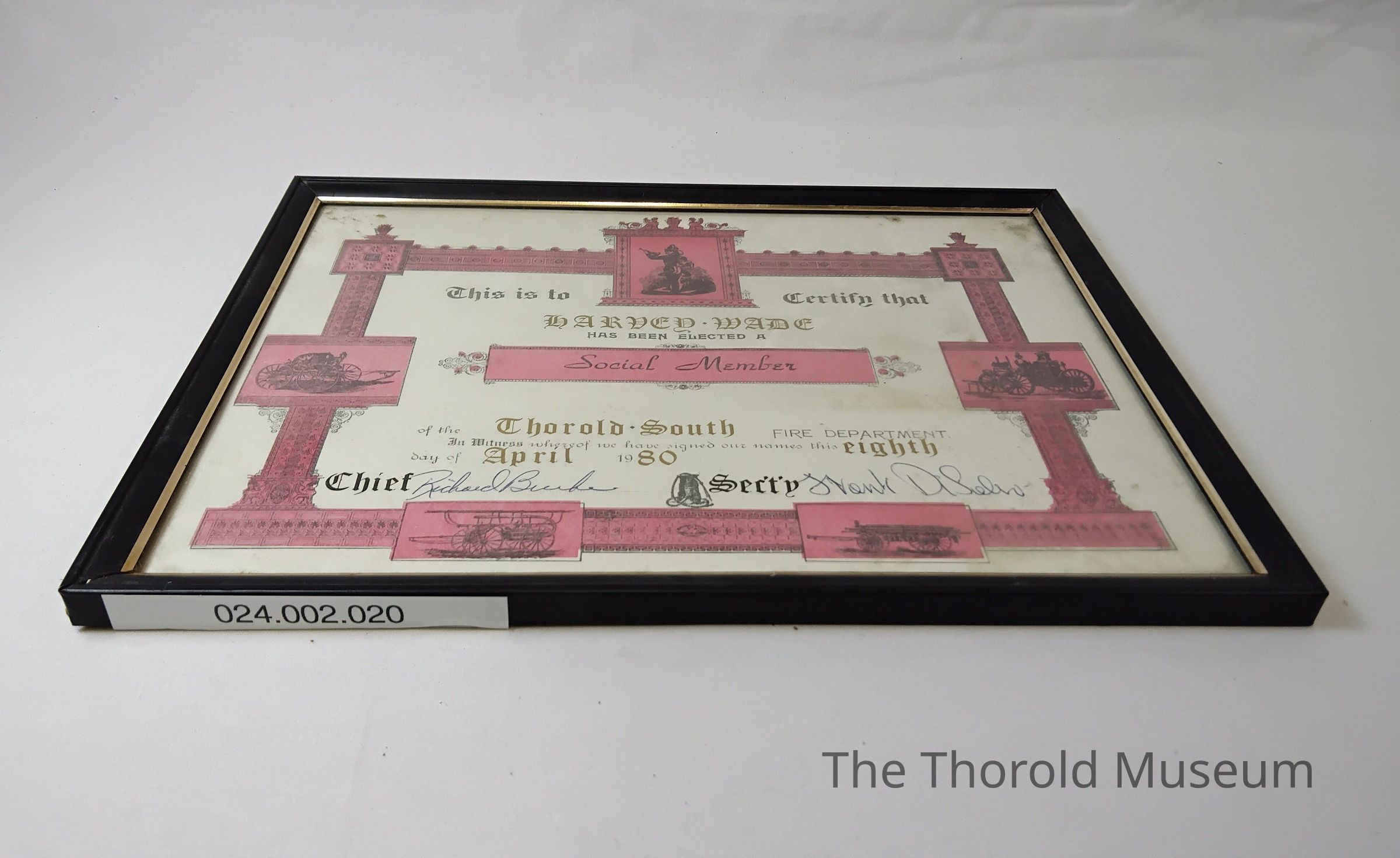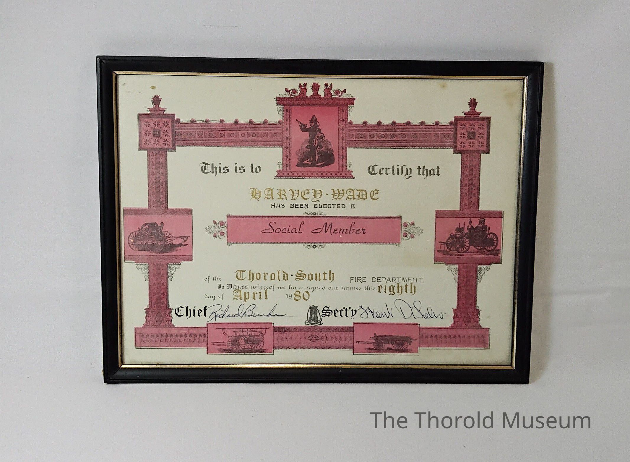 A certificate given to Harvey Wade for being a social member of the Thorold South Fire DepartmentCataloged By