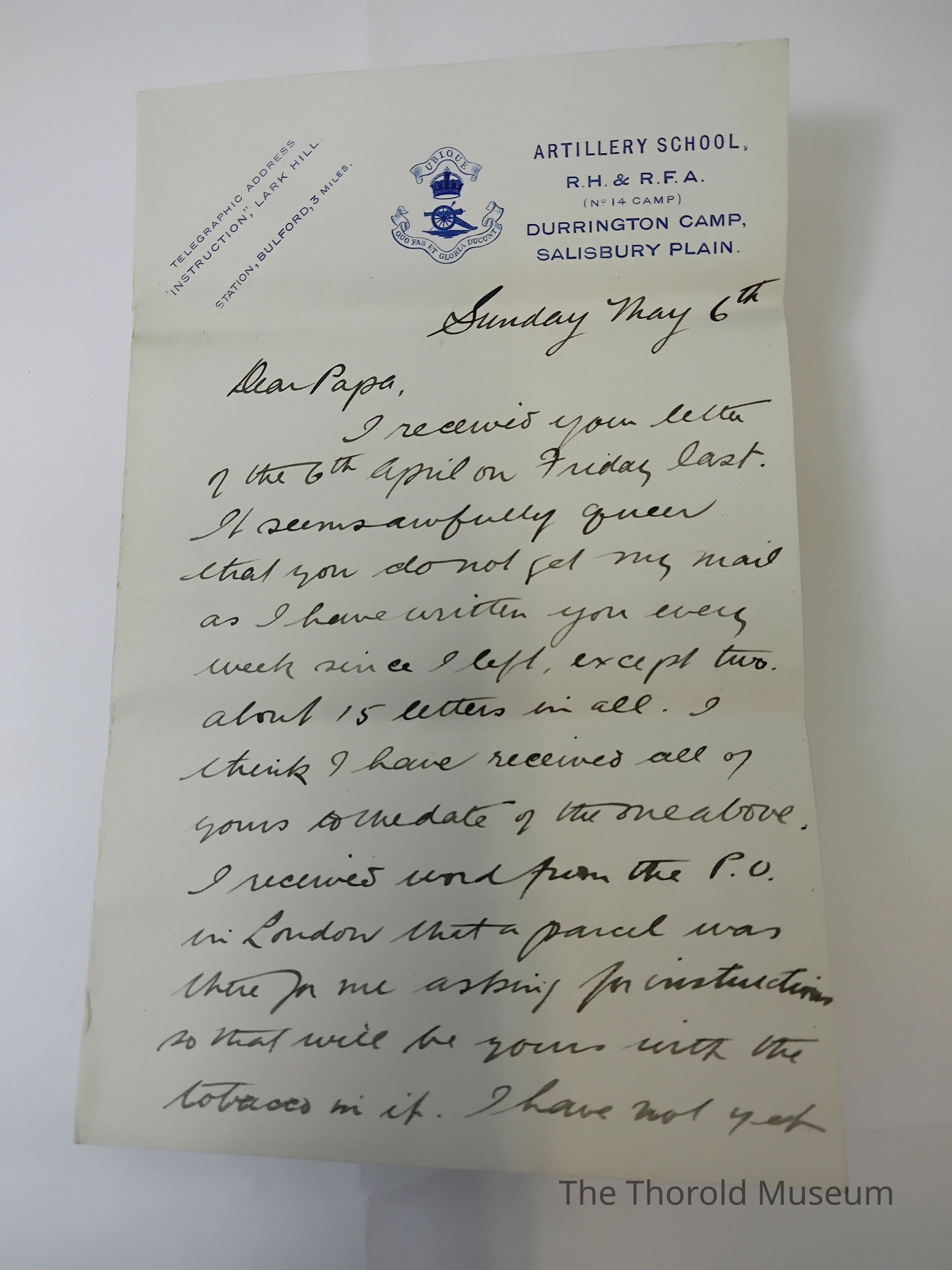 I received you letter of the 6th April on Friday last. It seems awfully queer that you do not get my mail sdI have written you every week since I left, except two. About 15 letter in all. I think it have received all of yours to the date of the one above. I recieved word from the P.O. in London that a parcel was there for me asking for instructions, so that will be yours with the tabacco in it. I have not yet received it. The P.O. is very slow as they got my instructions a week ago.