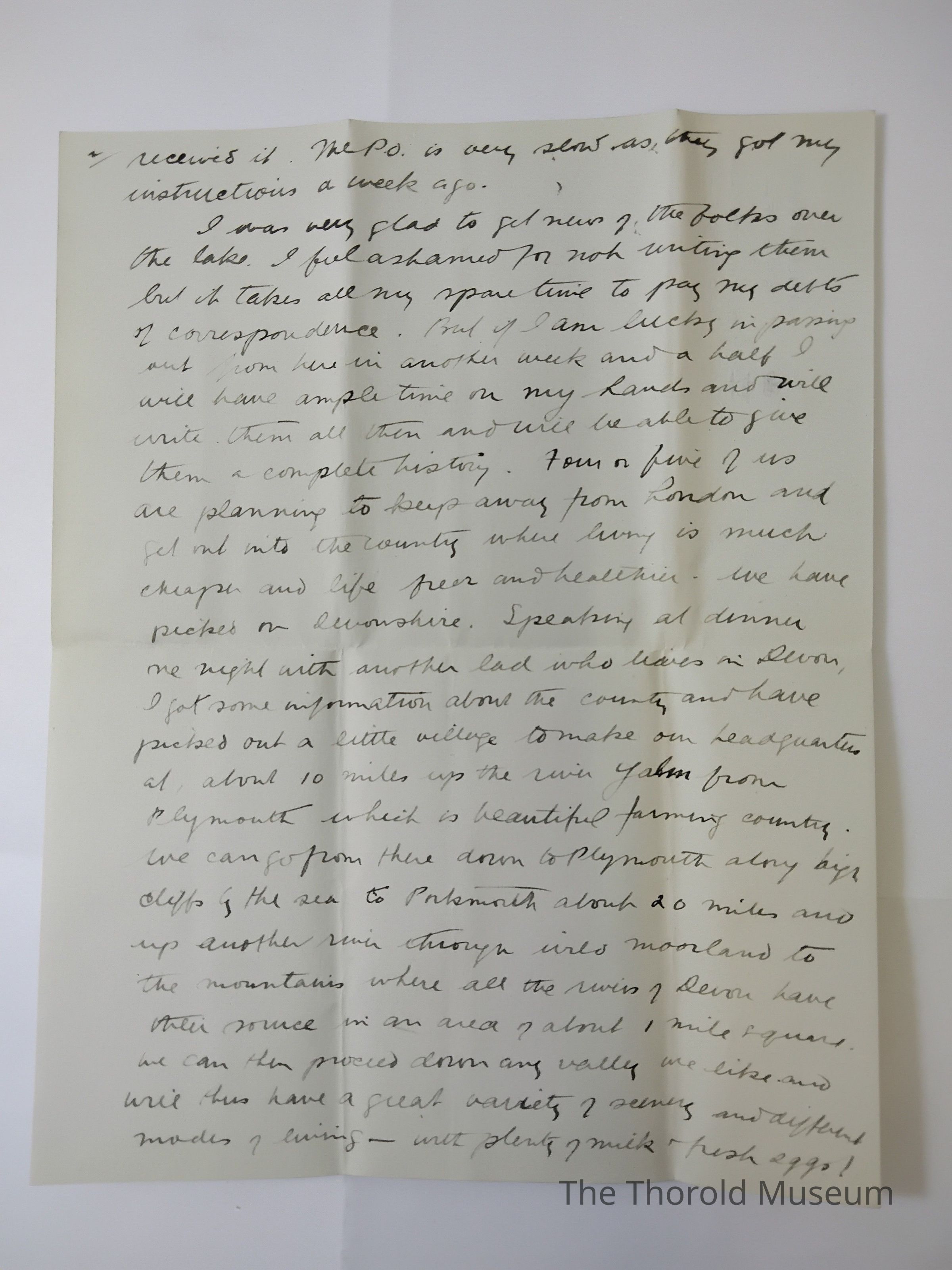 I was very glad to get news of the [?????] Over the lake. I feel ashamed for not writing them but it takes all my spare time to pay my debts of correspondence. But if I am lucky in paying out from here in another week and a half I will have ample time on my hands and will write them all then and will be able to give them a complete history. Four or five of us are planning to keep away from London and get into the country where living is much cheaper and live great and healthier. We have packed our [?????]shine. Speaking at dinner one night with another lad who [?????] In Devon, I got some information about the country and have picked out a little village to make our headquarters at, about 10 miles up the river [?????] From Plymonth which is beautiful farming country. We can go from there down to Plymonth [?????] By left of the sea to Plymonth the about 20 miles and up another river though [????]s moorland to the mountains where all the rivers of De[????] Have their source in an area of about 1 mile squared. We can then proceed down any valley we like and will thus have a great variety of [???????] And different modes of living - with plenty of milk + fresh eggs! That may sound expensive to you but just compare keeping oneself for two weeks in London without spending anything beyond bed and meals! The other way will cost us not more than half.