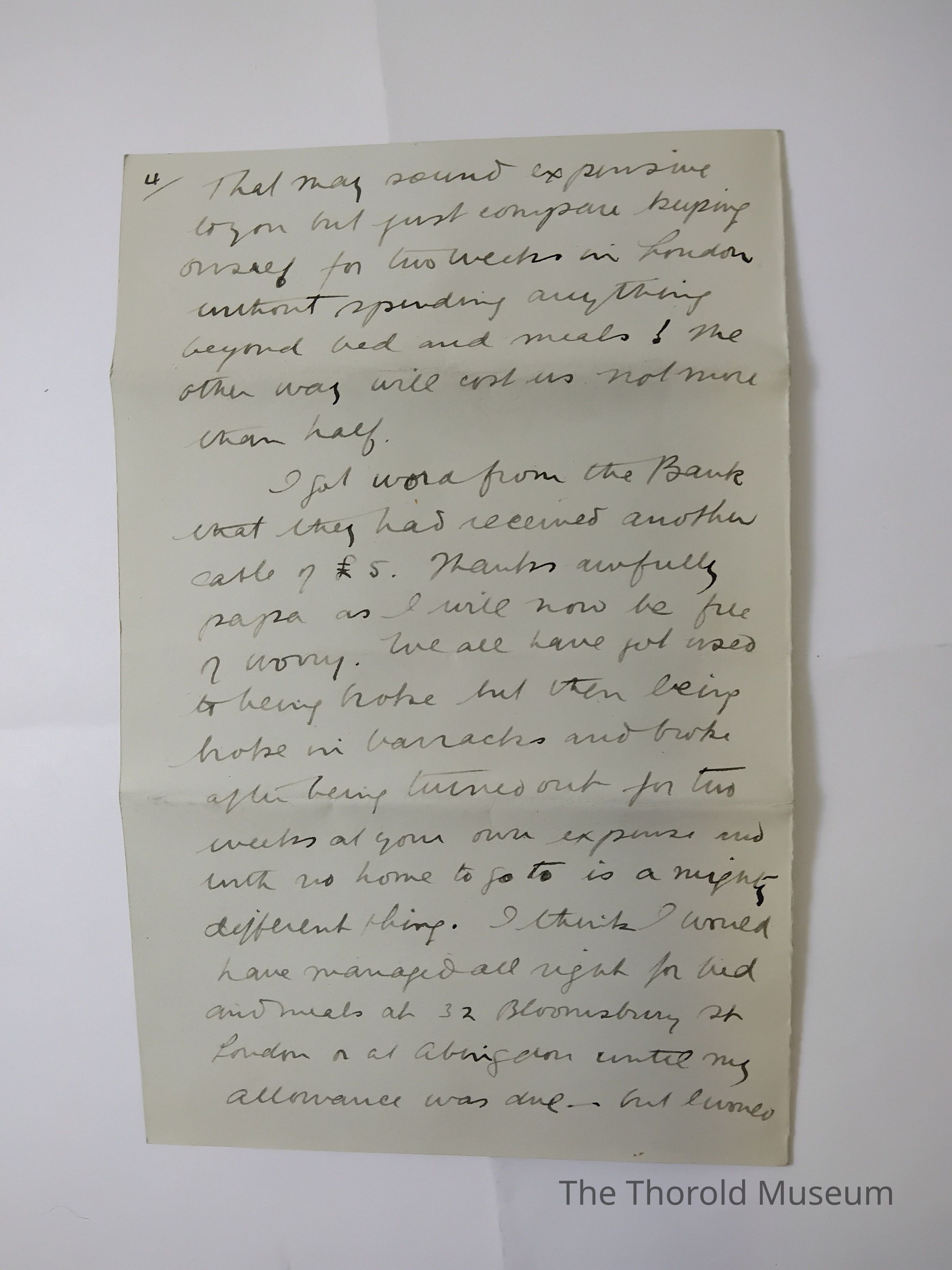 I got word from Bauk that they had received another cake of £5. [??????] Awfully papa as I now e full of worry.We all have got used to being broke but them being broke in barracks and broke after being turned out for two weeks at your own expense and with no home to go to is a trying different thing. I think I would have managed all right for beds and meals at 32 [????????????] St London or at [??????????] Untill my allowance was due - but I would have been fearfully [???????????].