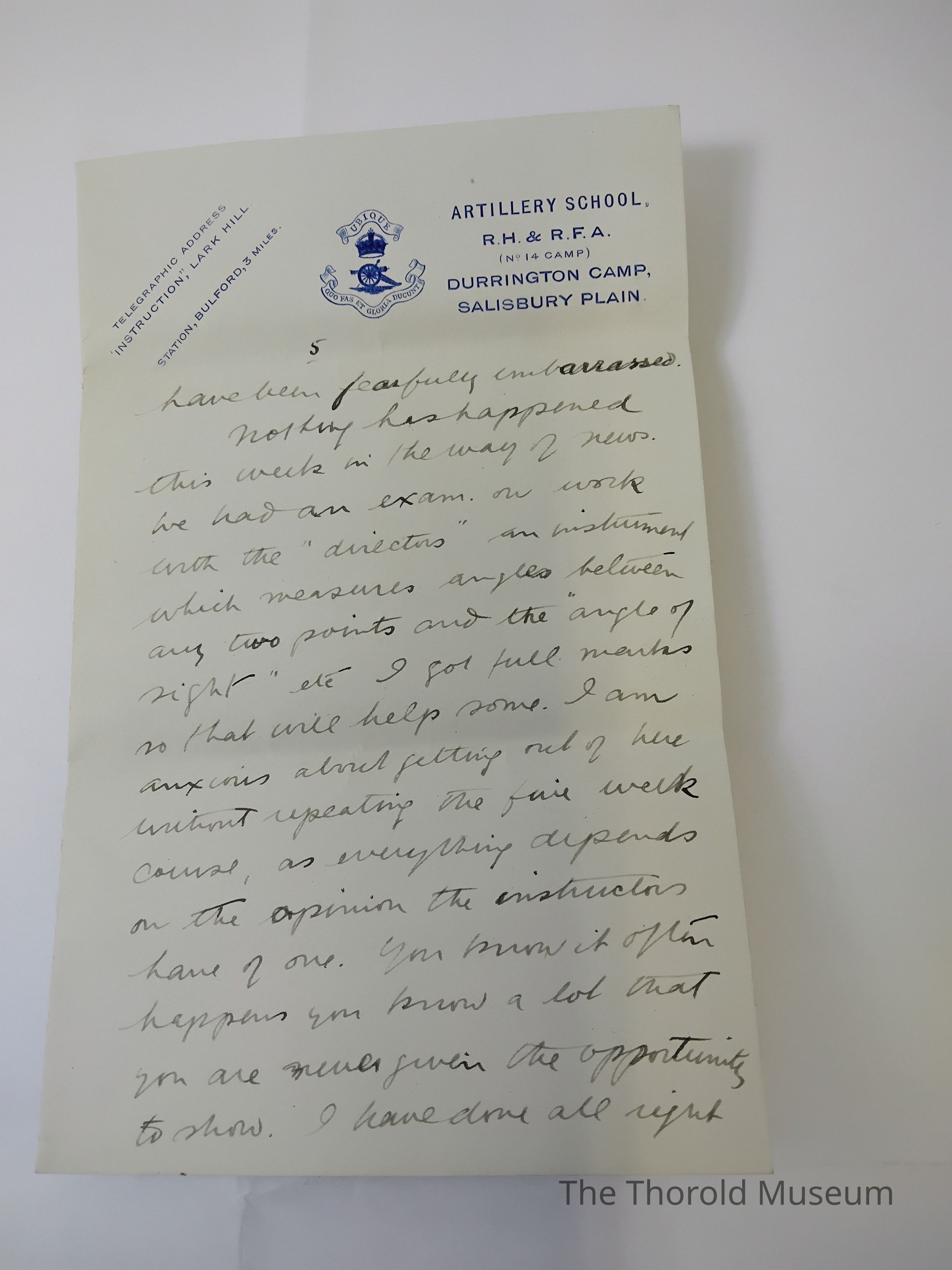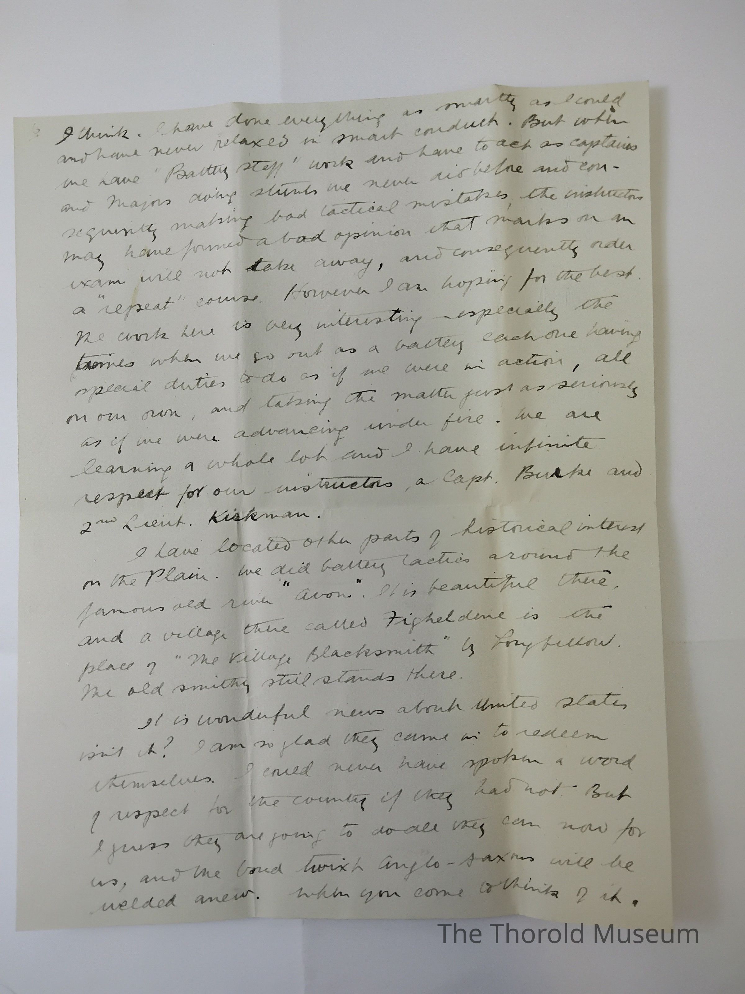 Nothing has happened this week in the way of news we had an exam on work with the "[?????????]" An instrument which measures angles between any two points and the "angle of sight" etc I got full marks so that will help some. I am anxious about getting ut of here without repeating the full week course, as everything depends on the opinion the instructors have of one. You know it often happens you know alot that you are never given the opportunity to show. I have done all right I think. I have done everything as [????????] As I could and have never relaxes in [??????] [?????????]. But when we have "Battery Staff" work and have to act as captains and mayors doing stunts we never did before and consequently making bad tactical mistakes, the instructors may have formed a bad opinion that that marks on an exam will not take away, and consequently order a "repeat" course. However I am hoping for the best. The work here is very interesting, especially the [???????] When we go out as a battery each one having special duties to do as if we were in action, all on our own, and taking the matter just as seriously as if we were advancing under fire. We are learning a whole lot and I have infinite respect for our instructors, a capt. Burke and 2nd [????]. Kirkman.