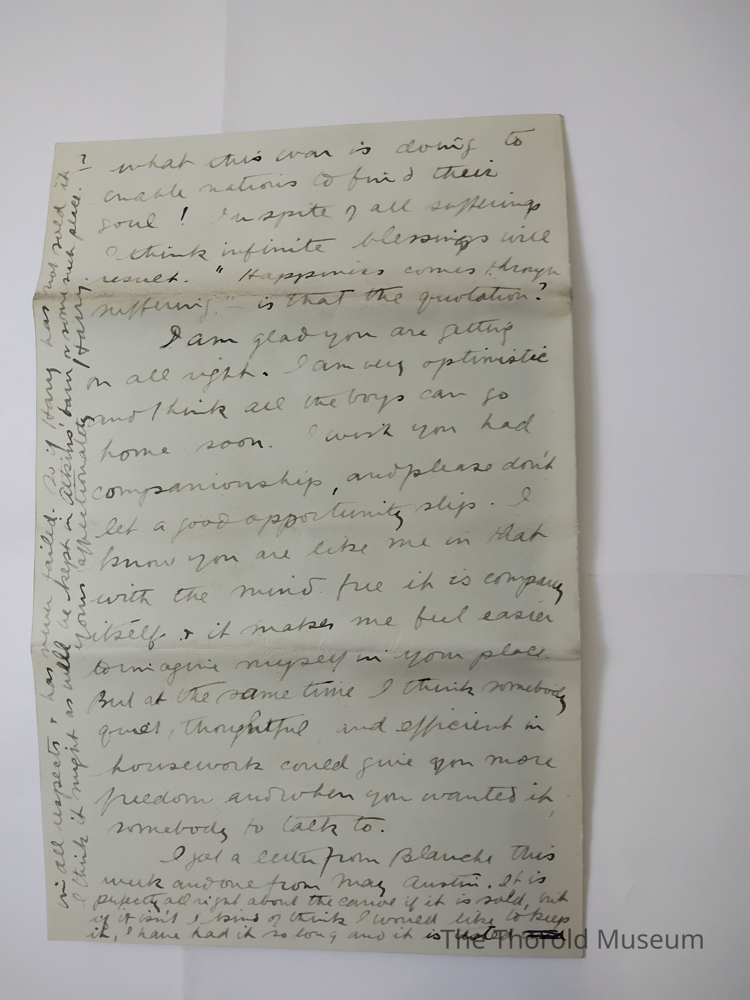 I am glad you are getting on all right. I am very optimistic and think all the boys can go home soon. I wish you had companionship, and please don't let a good opportunity slip. I know you are like me in that with the mind free it is company itself + it makes me feel easier to imagine myself in your place. But at the same time I think somebody quiet, thoughtful and efficient in housework could give you more freedom and when you wanted it, somebody to talk to.
