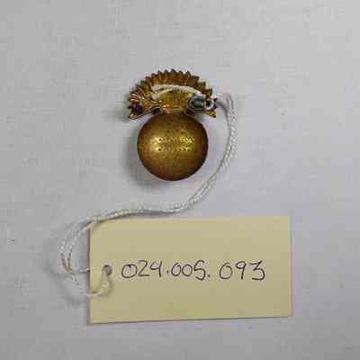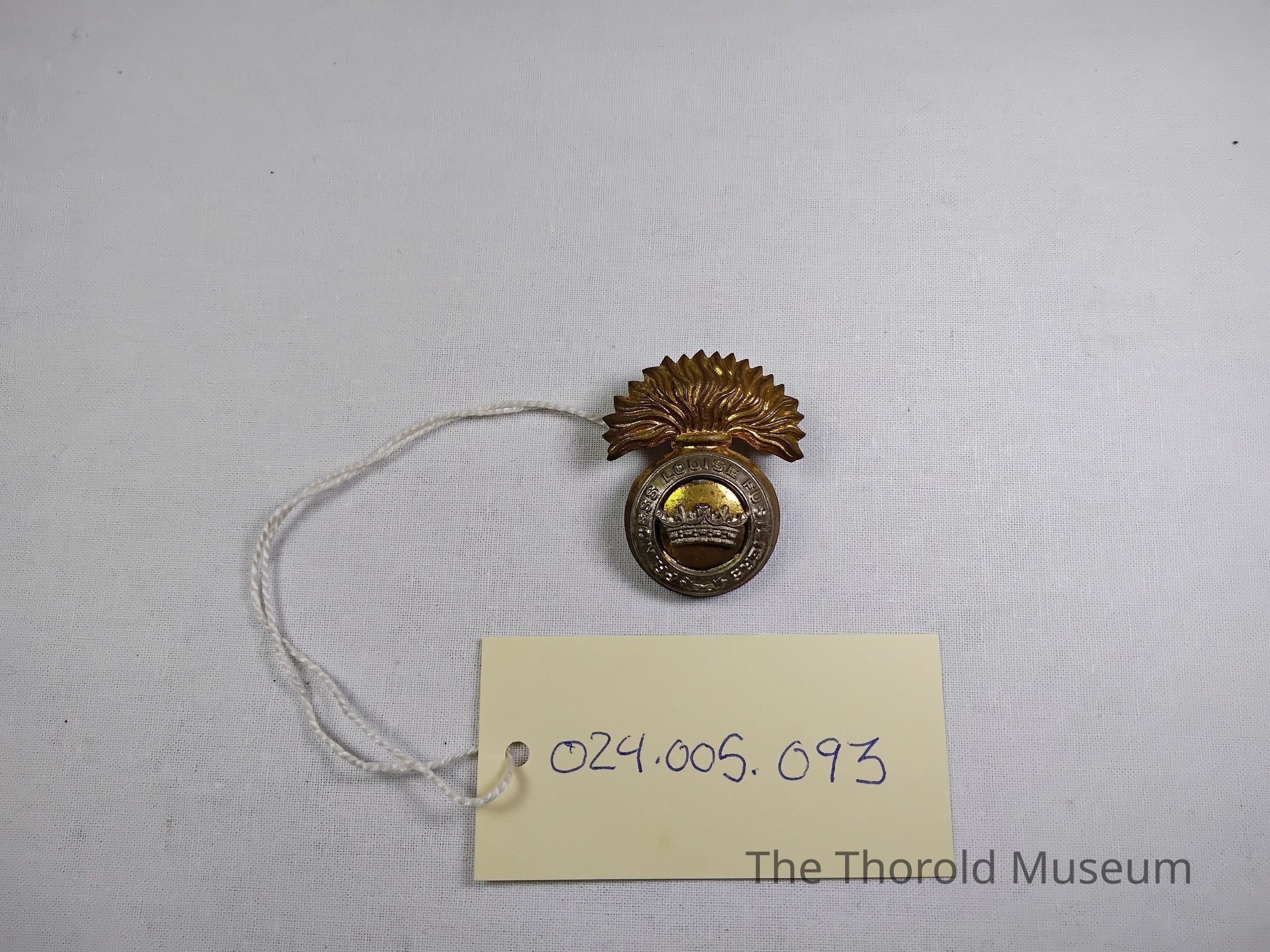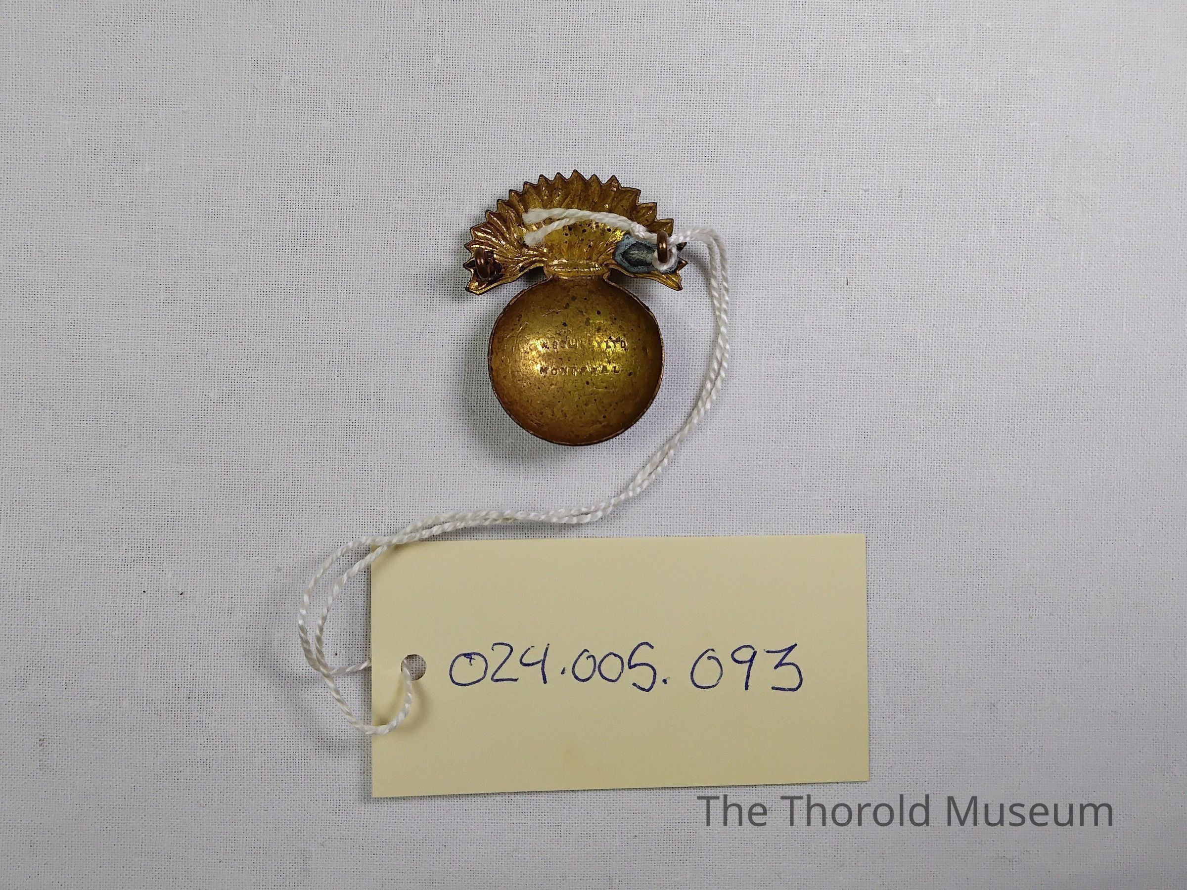 A gold and silver hat pin from the Canadian primary reserve light infantry unit, named the 66th Battalion. Shaped as a circle encompassing a crown which tapers and flares out into a shallow fan shape.Cataloged By