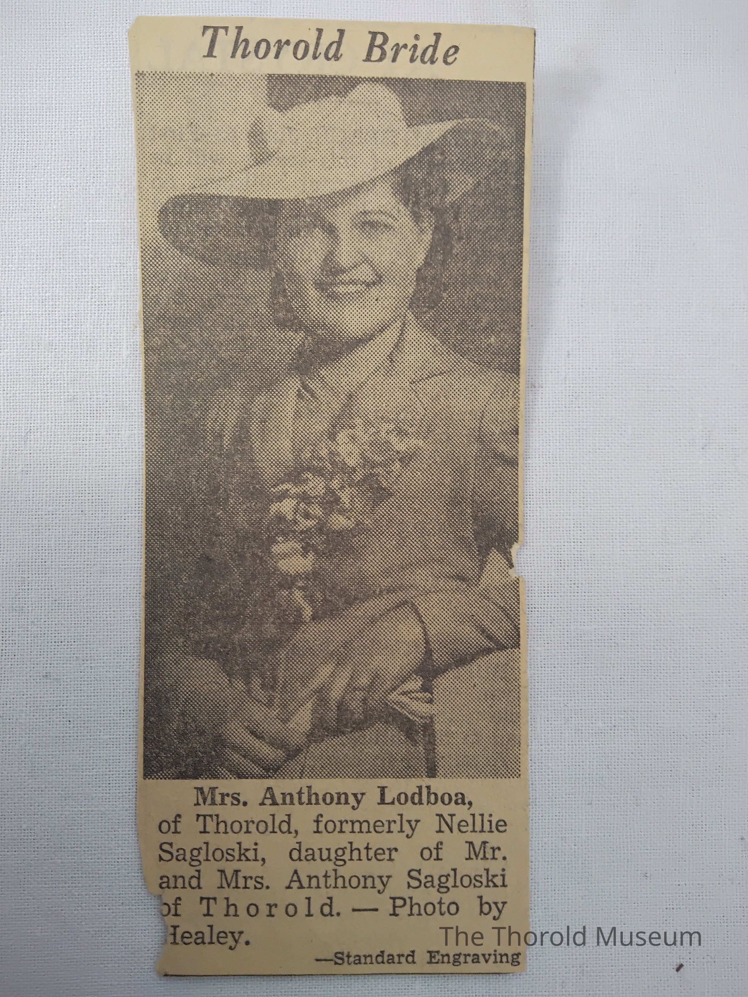 Newspaper clipping of Thorold bride Mrs. Anthony Lodboa