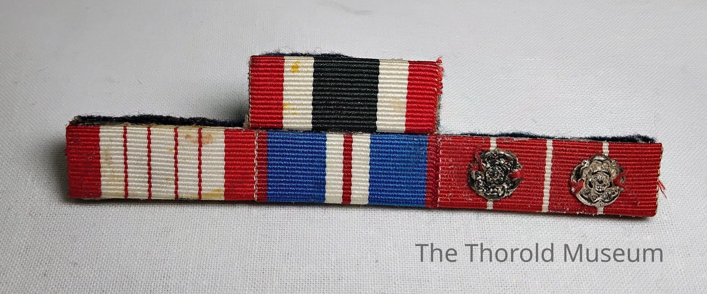 Consists of ribbons, listed top to bottom, left to right, Special Service Medal, Canadian Centennial Medal, Queens Golden Jubilee Medal, Canadian Forces’ Decoration 2 Rosette