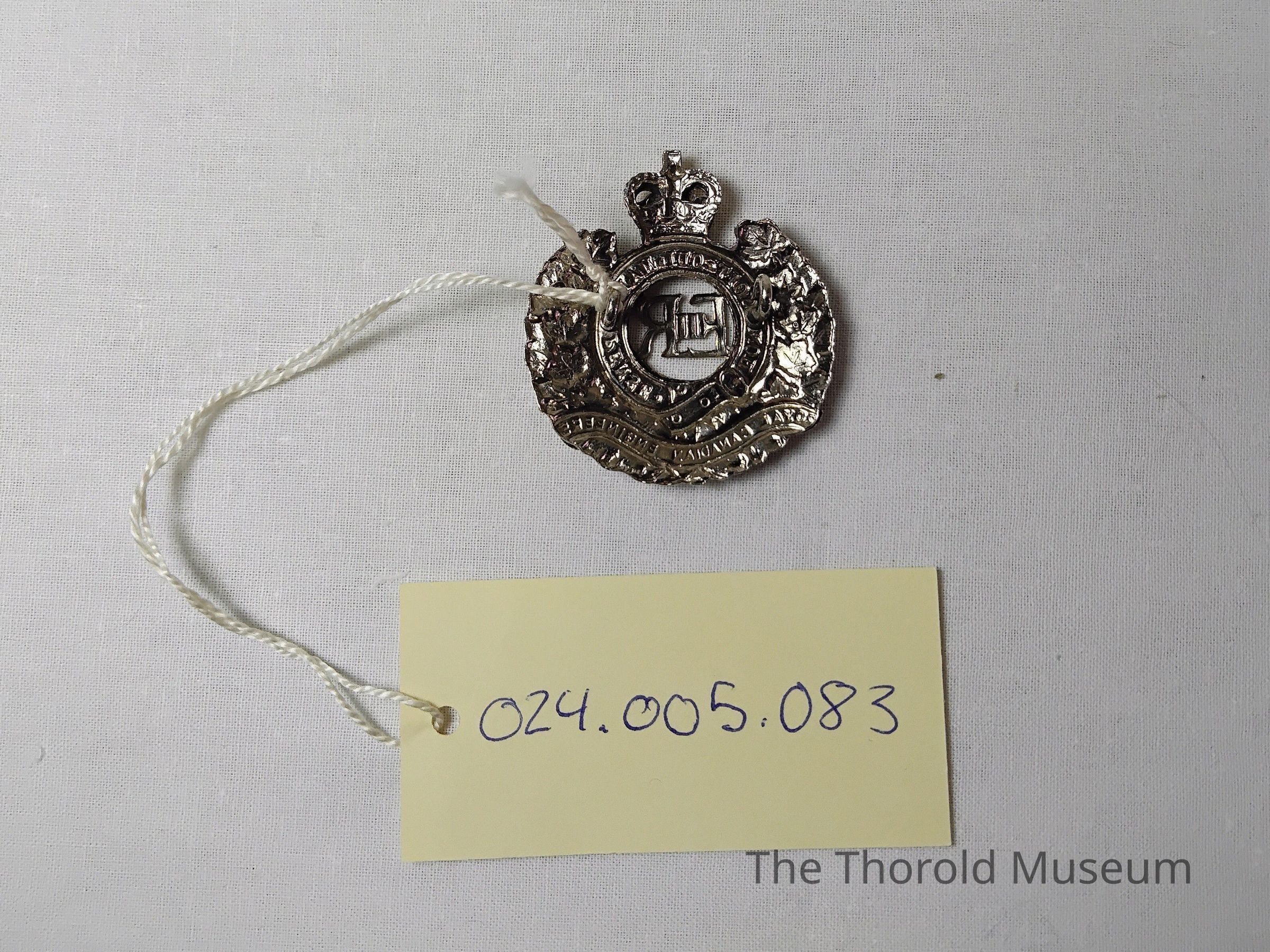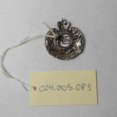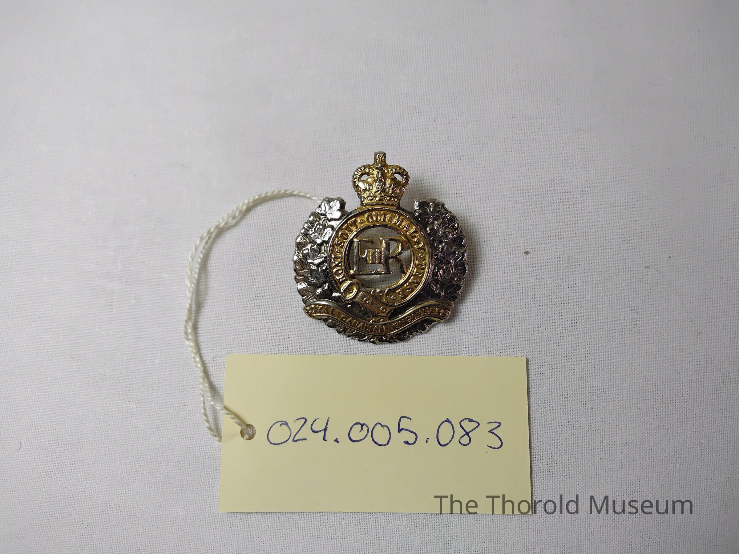 Circular silver and gold pin. Decorated with a crown sitting atop a circular wreath of Canadian leaves, surrounding a circular belt. Inscribed with letters 'ER'Cataloged By