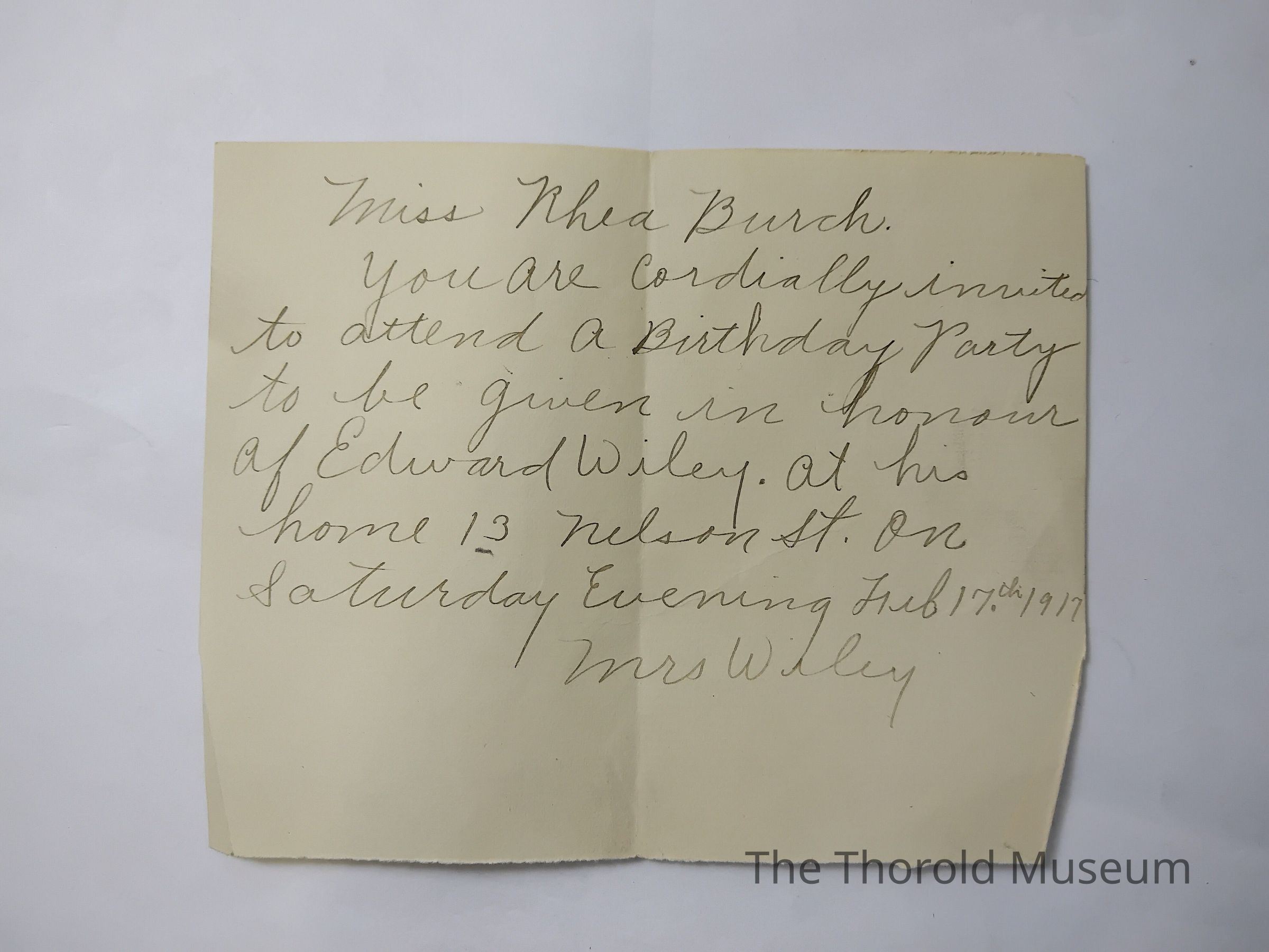 You are cordially invited to attend a birthday party to be given in honour of Edward Wiley, at his home 13 Nelson St. On Saturday evening Feb 17th 1917