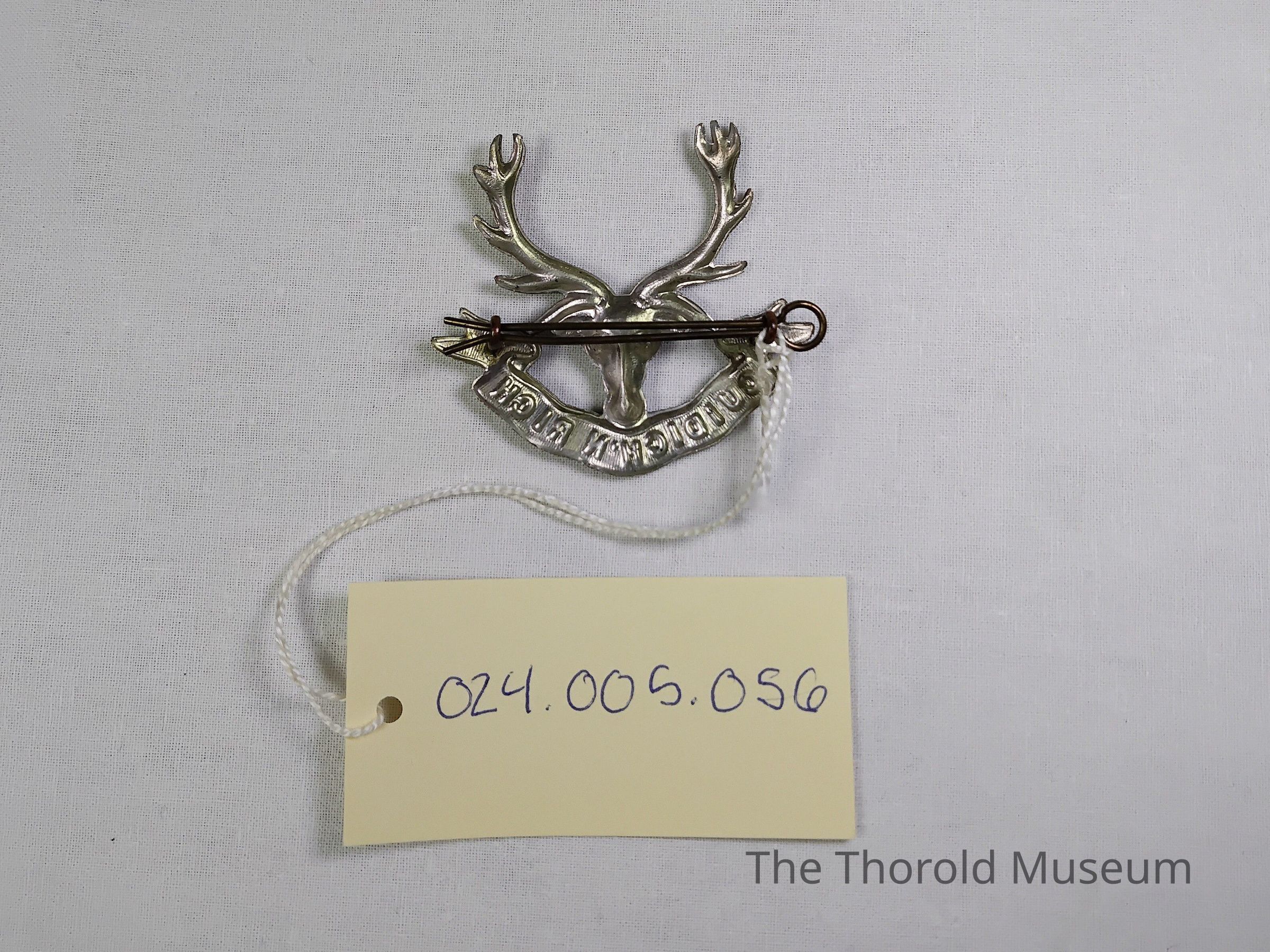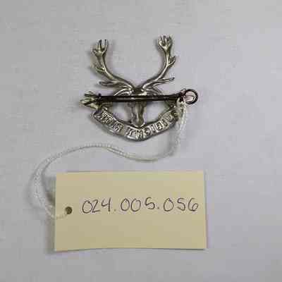 A silver British Seaforth Highlanders pin. Depicts the head of a stag and a banner reading the regiment motto.Use