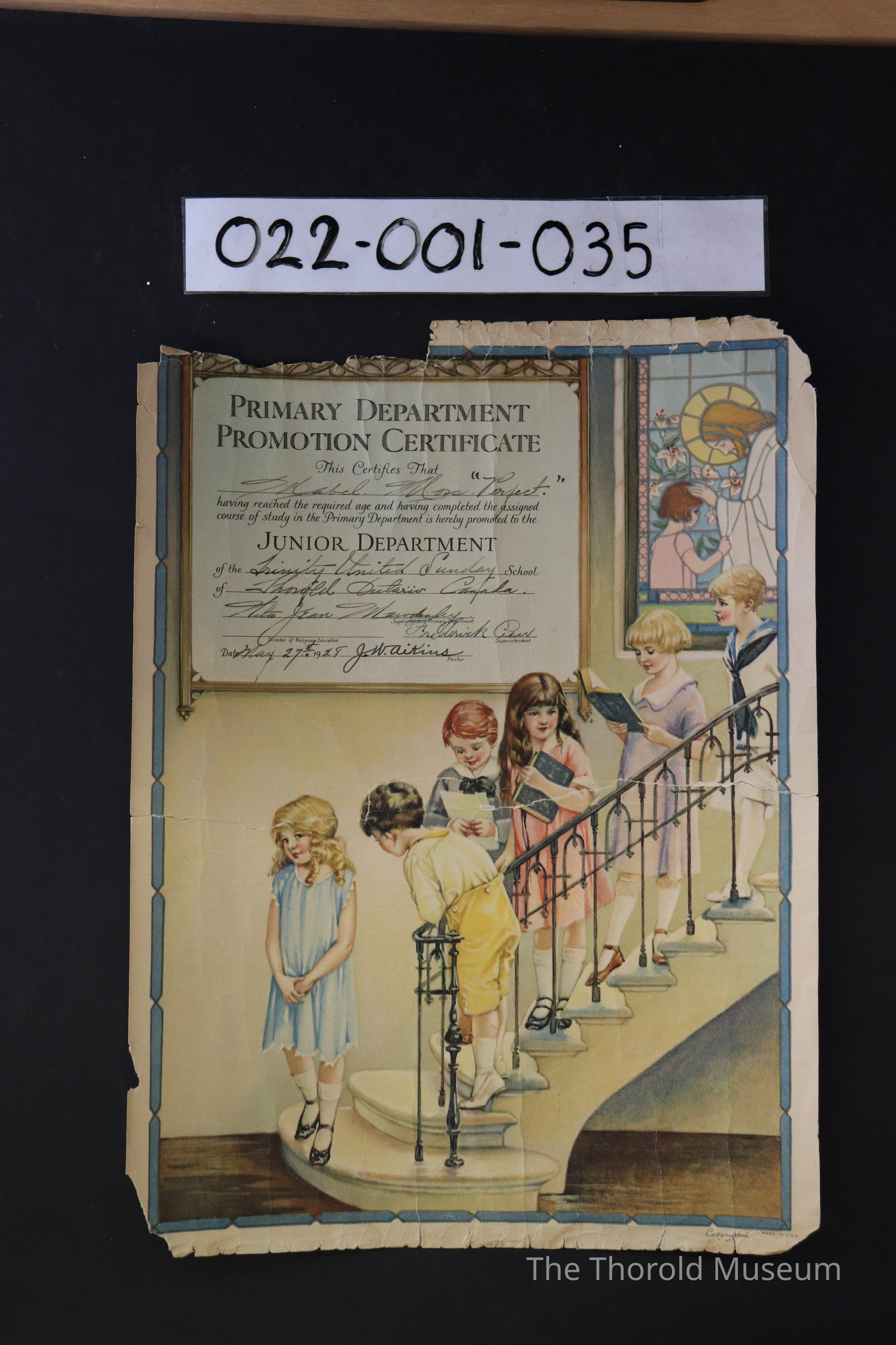 A certificate for the promotion of Mabel Moss from Primary to Junior, from the primary department for Trinity United Church Sunday School. At this time, Mabel was ten years old, as this certificate is dated to May 27th, 1928.Photograph Details