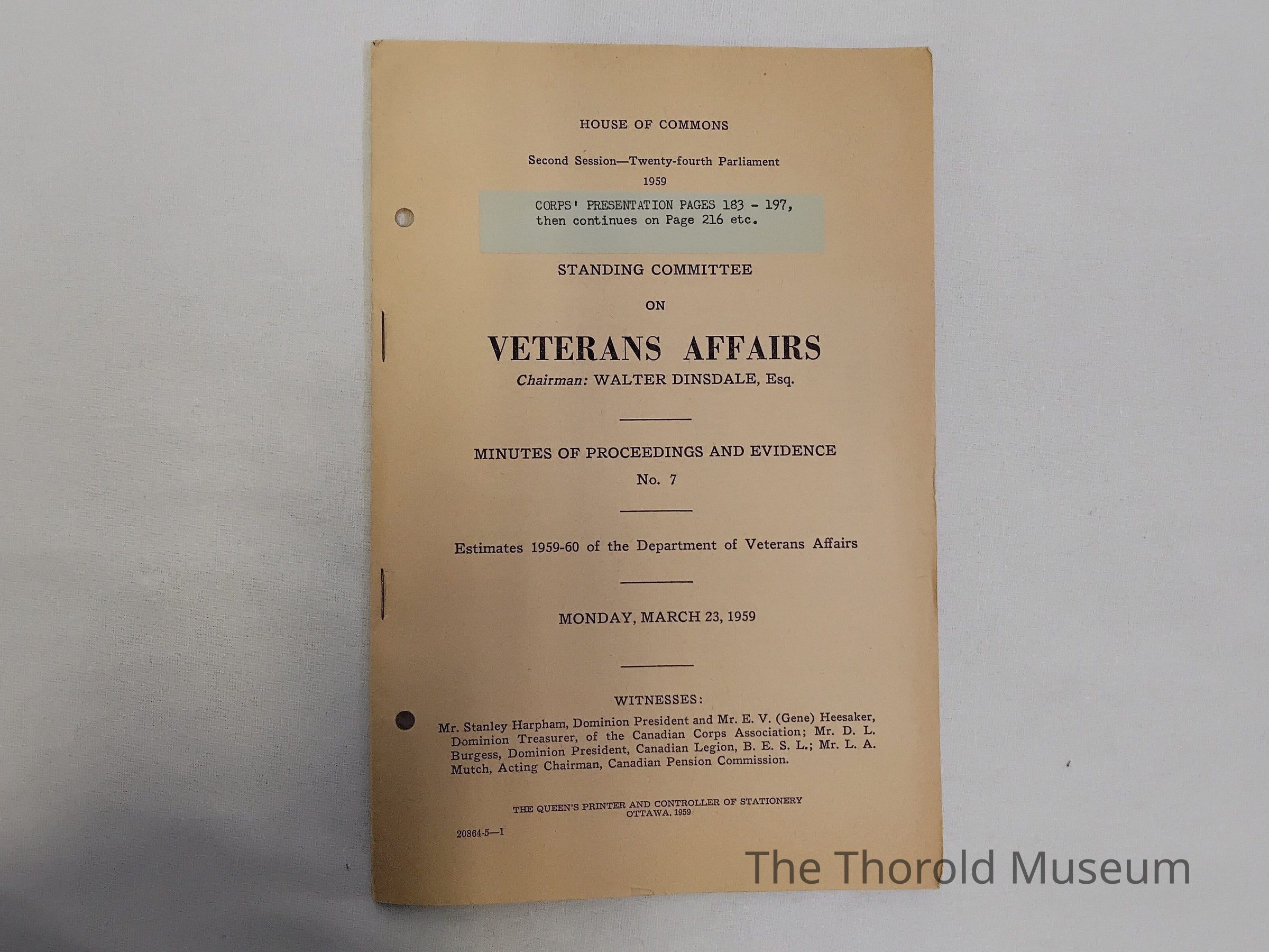 A book detailing the minutes of proceedings and evidence during a veterans affairs meeting held on Monday March 23ed, 1959Cataloged By