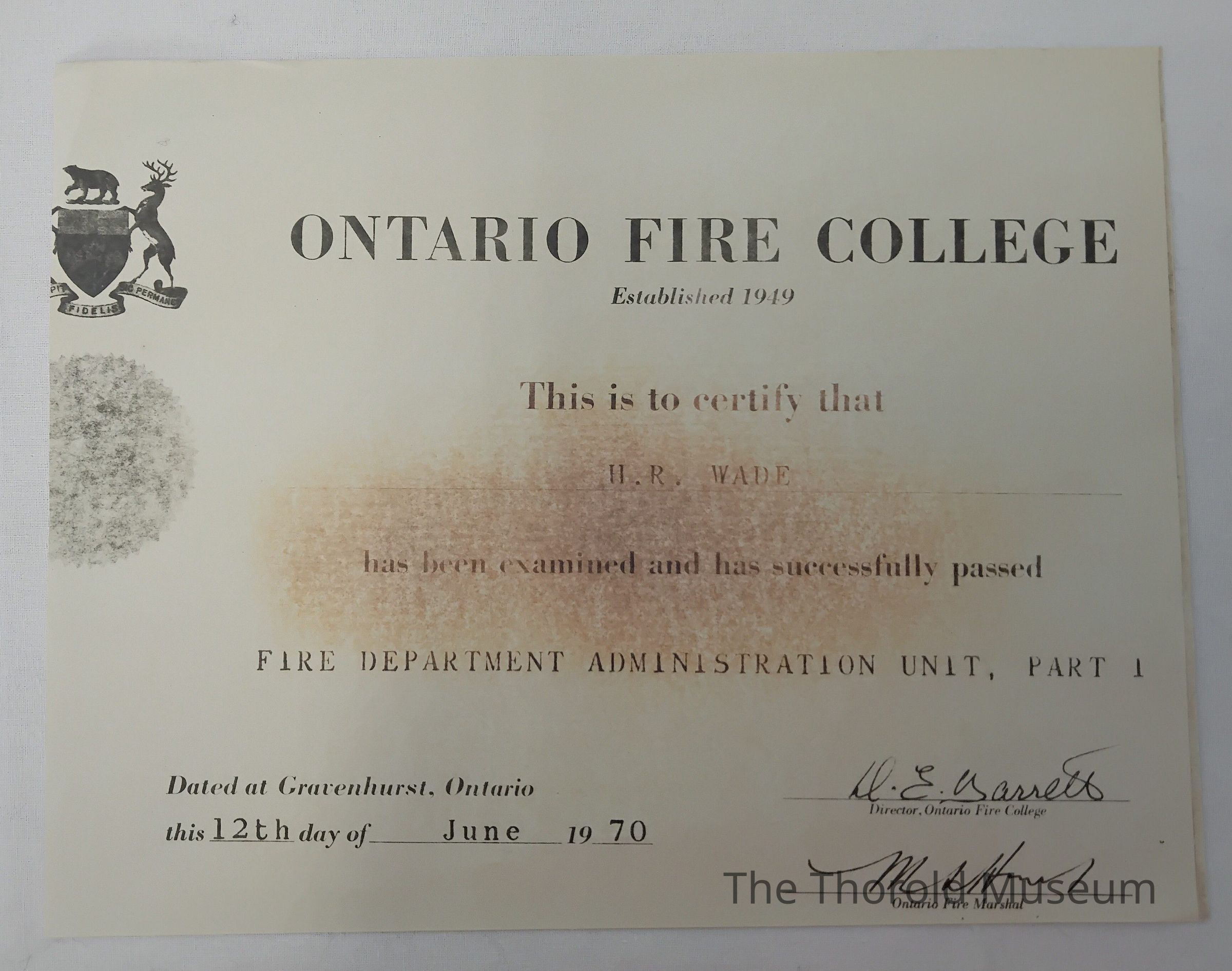 A printed paper copy of H. Wade's Ontario Fire College exam certificate