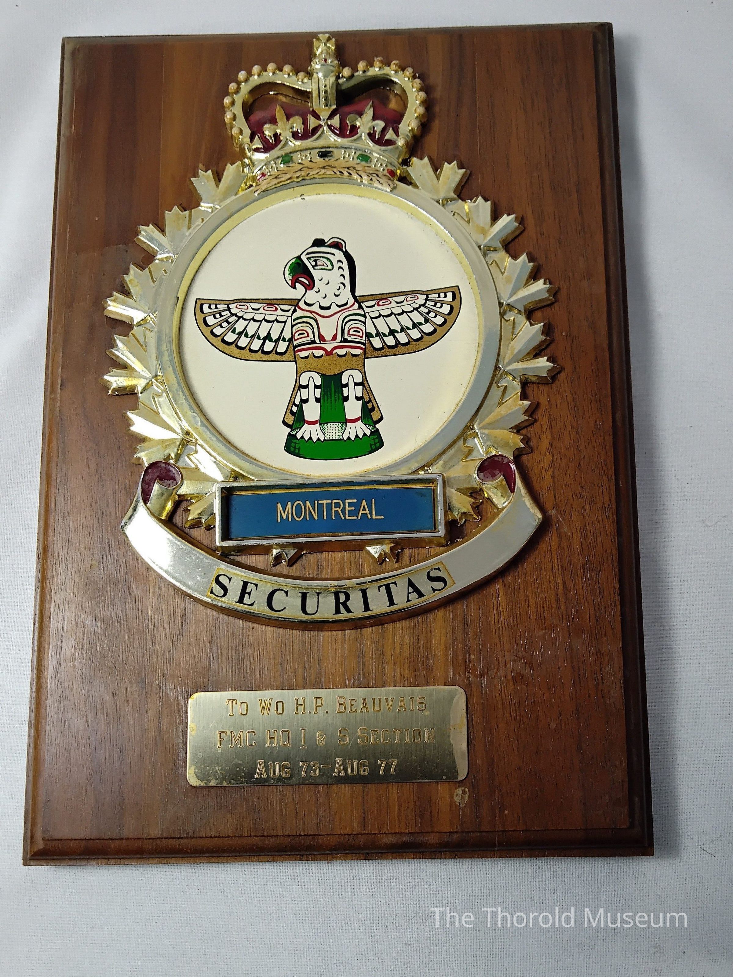 Towards the bottom on the front side of the plaque, on the silver rectangleTranscription