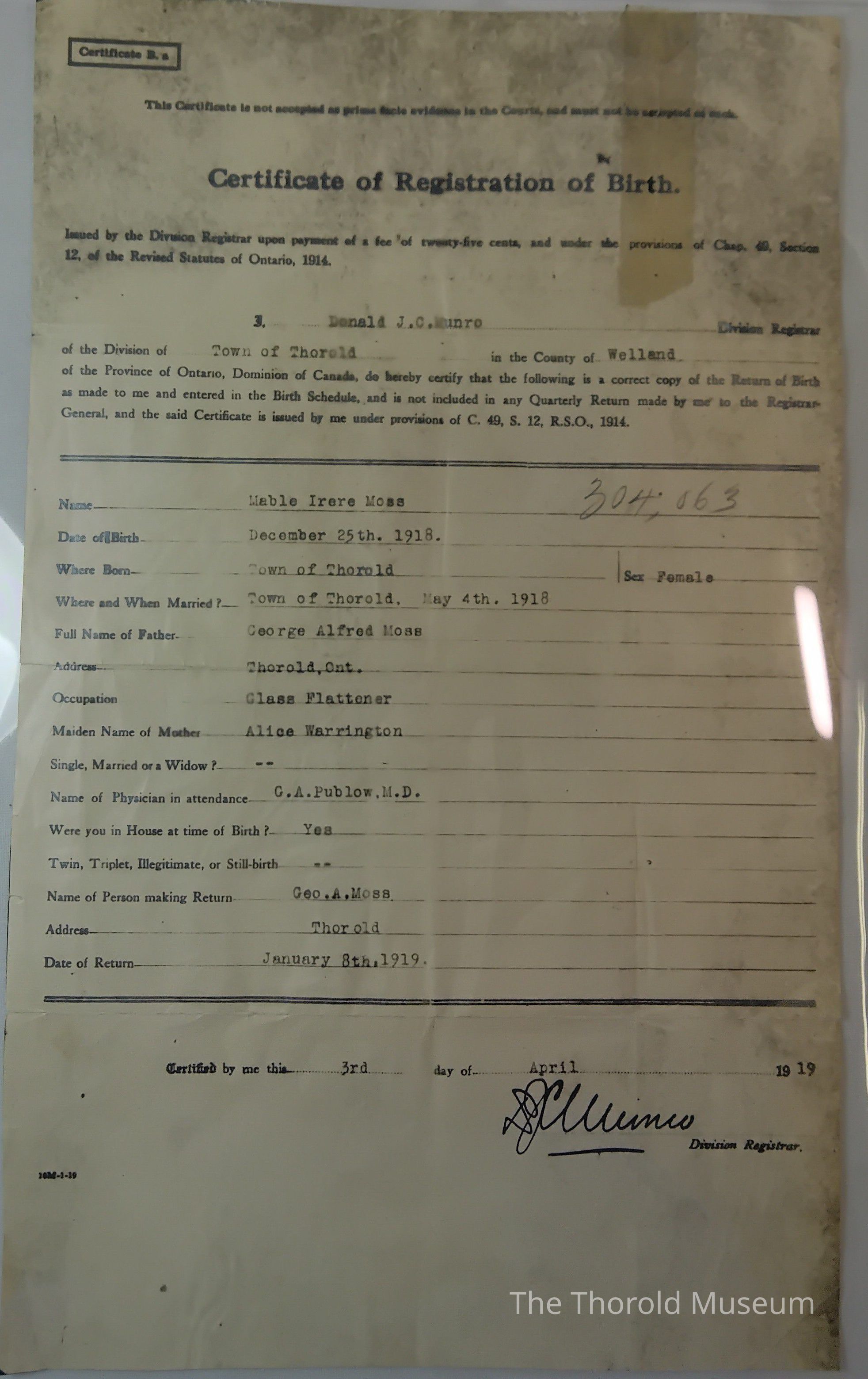Thorold birth certificate for Mabel Moss. Date of birth December 25th, 1918, however, the document was certified at the bottom on April 3rd, 1919.Photograph Details