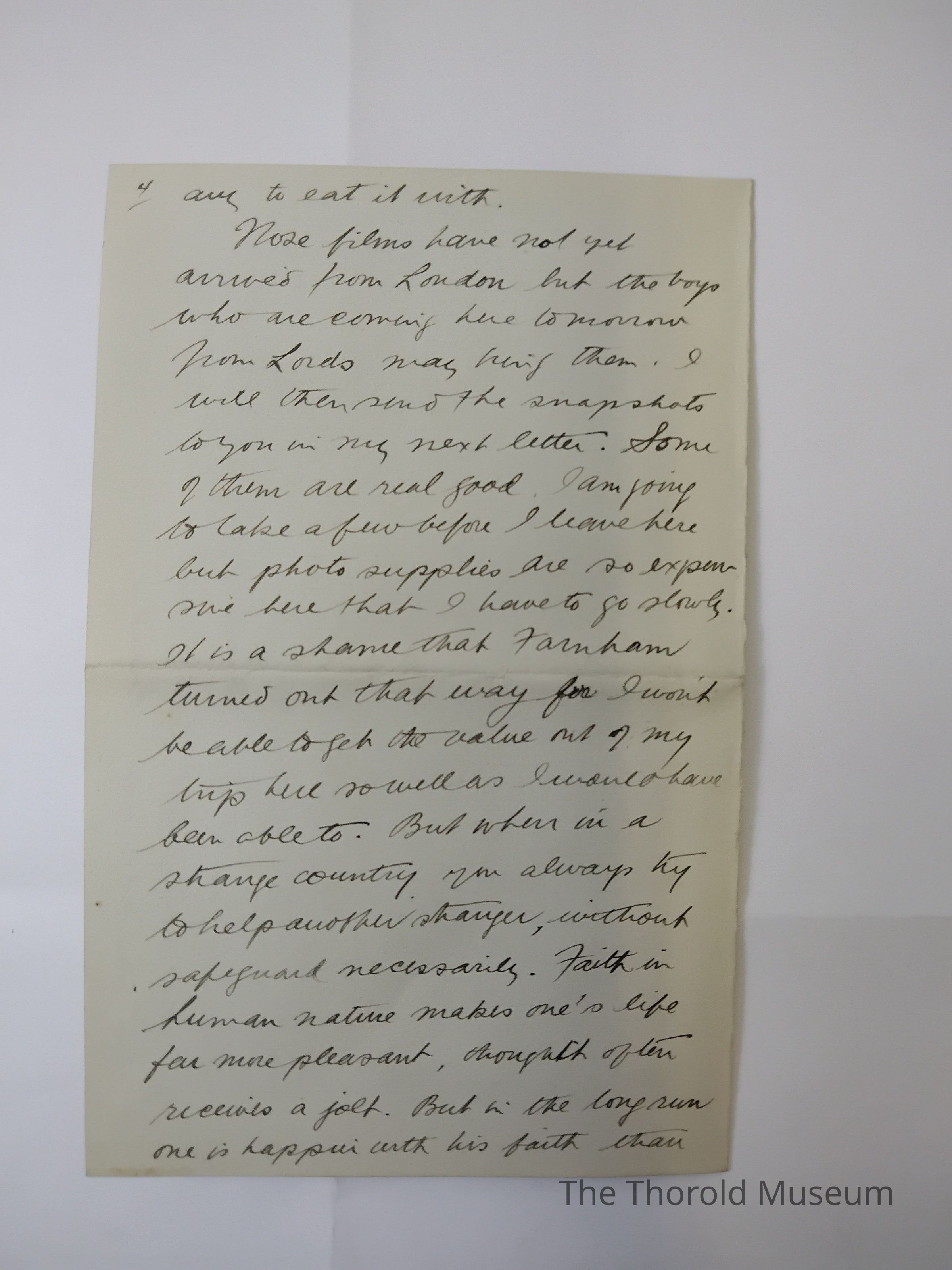 Those films have not yet arrived from London but the boys who are coming here tomorrow from Londs was [?????] Them. I will then send snapshots to you in my next letter. Some of them are real good. I am going to take a few before I leave here but photo supplies are so expensive here that I have to go slowly. It is a shame that Farnham turned out that way for I wont be able to get the value out of my trip here so well as I should have been able to. But when in a strange country you always try to help another stranger, without safeguard necessarily. Faith in human nature makes one's life far more pleasant, though it often receives a jolt. But in the long run one is happier with his faith than with his lost money, don't you think so? I know I would hate to be so constr[???]ted as to dought everyone.