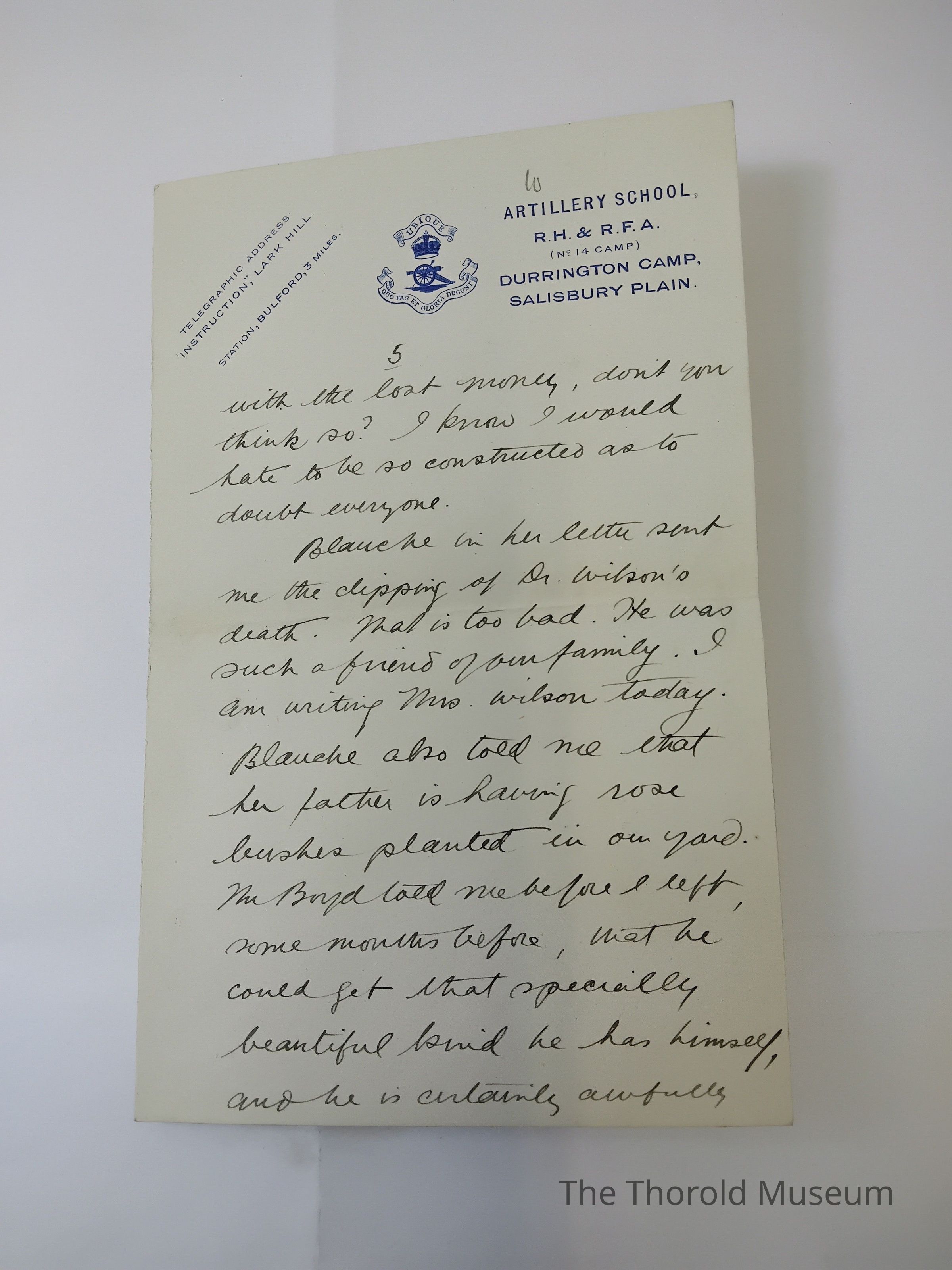 Blauche in her letter sent me the clipping of Dr. Wilsons death. That is too bad. He was such a friend of our family. I am writing Mis. Wilson today. Blauche also told me that her father is having rose bushes planted in our yard. Mr. Boyd told me before I left, some months before, that he could get that specially beautiful [?????]he has himself, and he is certainly awfully decent to have them planted and everything. Mr. [??????] Who is going to do it is an expert gardener, so leave everything to him. He does Mr. Boyds gardening and also assists in Harry Pellatt's gardens I believe. Our little old backyard will be great when it is full of the sent of roses, and the flowers is undoubtedly the best ever.