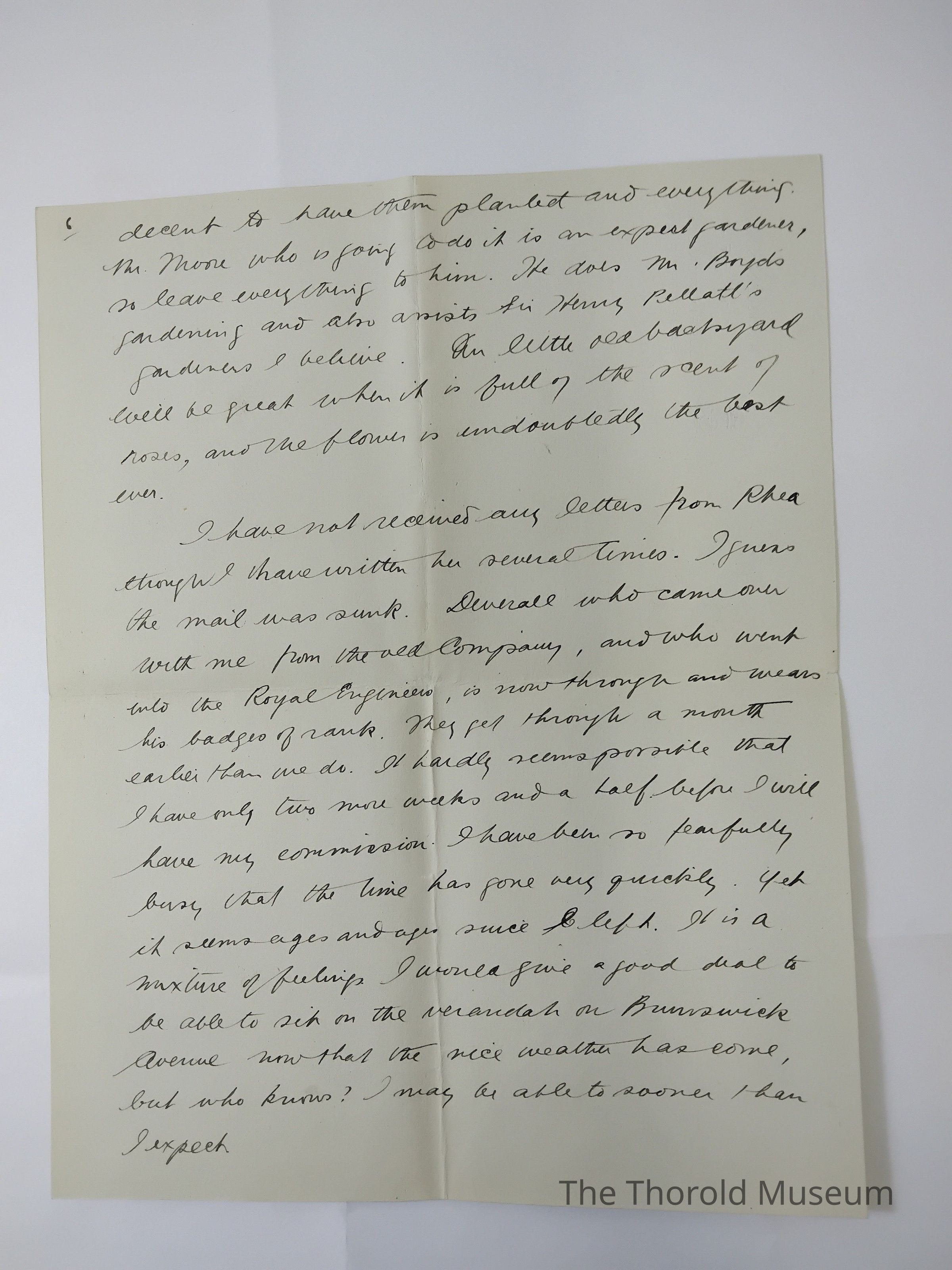 I have not received any letters from Rhea though I have written her several times. I guess the mail was sunk. Deverall who came over with me from the old company, and who went into the Royal Engenieers, is now though and wears his badges of rank. They get though a month earlier than we do. It hardly seems possible that I have only two more weeks and a half before I will have my commission. I have been so fearully busy that the time has gone very quickly. Yet it seems ages and ages since I left. It is a mixture of feelings. I would give a good deal to be able to get on the [???????????] On Brunswick avenue now that the nice weather has come, but who knows? I may be able to sooner than I expect.