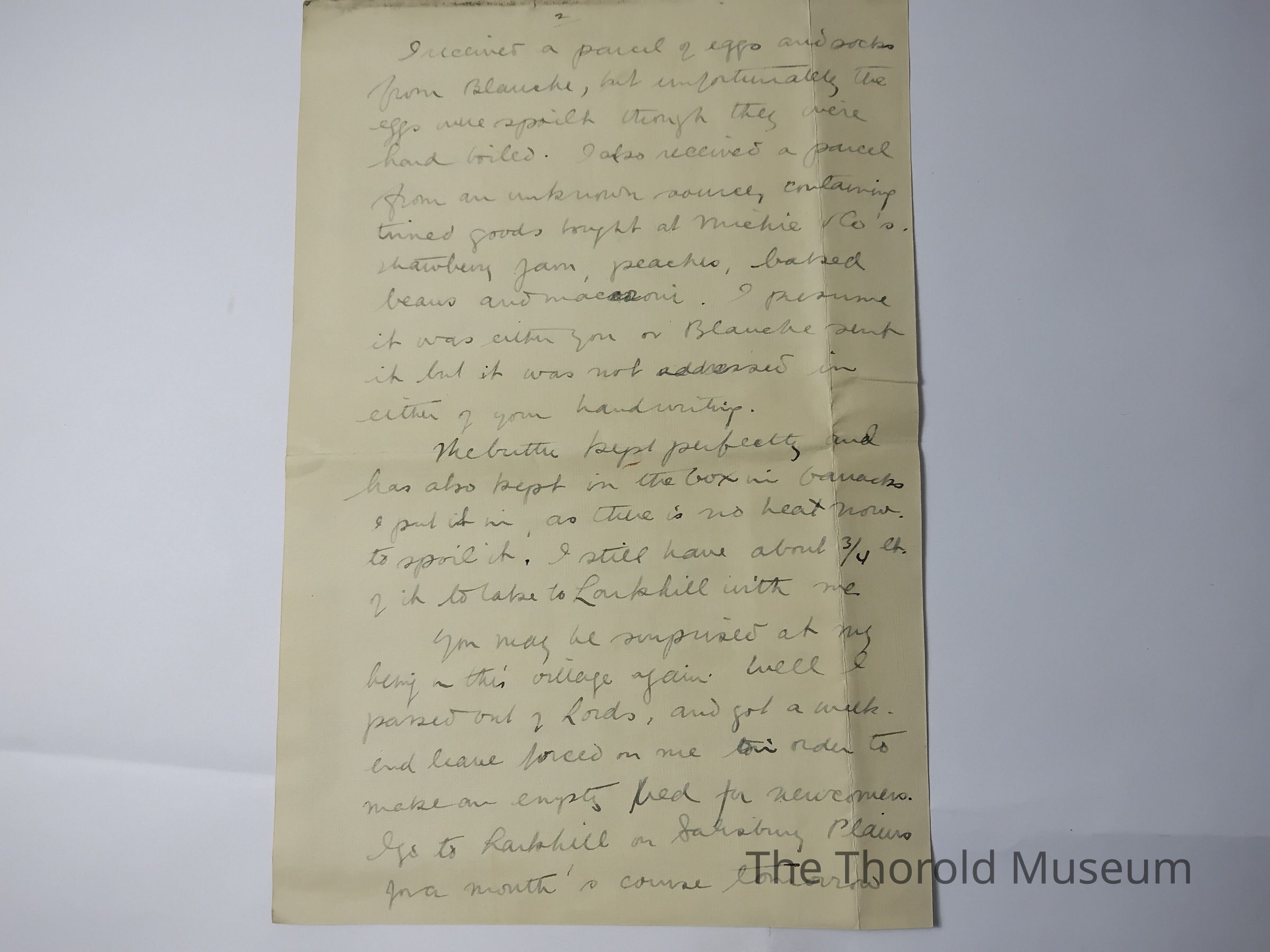 I received a parcel of eggs and socks from Blauche, but unfortunately the eggs were spoiled though they were hard boiled. I also received a parcel from an unknown sender containing [??????] goods bought at [???????] Co's. Strawberry jam, peaches, baked beans and macconi. I presume it was is was from either you or Blauche sent is but is was not addressed in either of your handwritings.