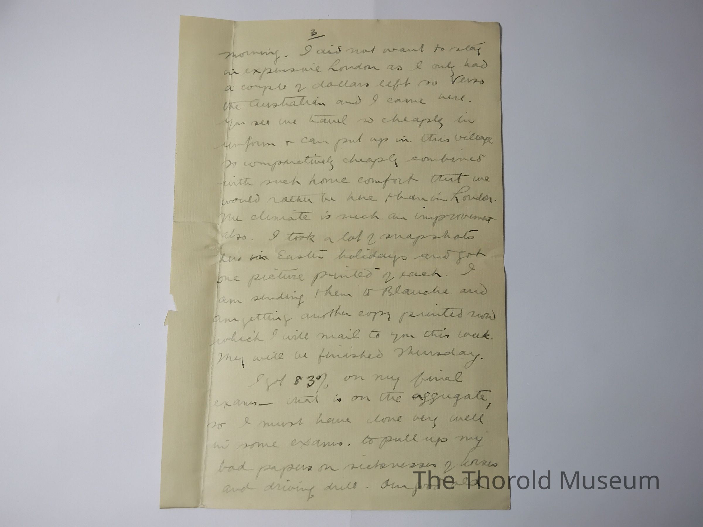 You may be surprised at my being in the village again, well I [?????] One of [?????], and got a weekend leave forced on me in order to make an empty [????] For newcomers. I go to Lakehill on Saturday planing for a month's course tomorrow morning. I did not want to stay in expensive London as I only had a couple of dollars left so verys the [???????????] And I came here. You see we travel so cheaply in uniform + can put up in this village so comparatively cheaper confined with such home comfort that we would rather be here than in London. The climate is such an improvement also. I took a lot of snapshots here in Easter holiday and got one pristine printed of each. I am sending them to Blauche and am getting another copy printed now which I will mail to you this week. They wil be finished this Thursday.