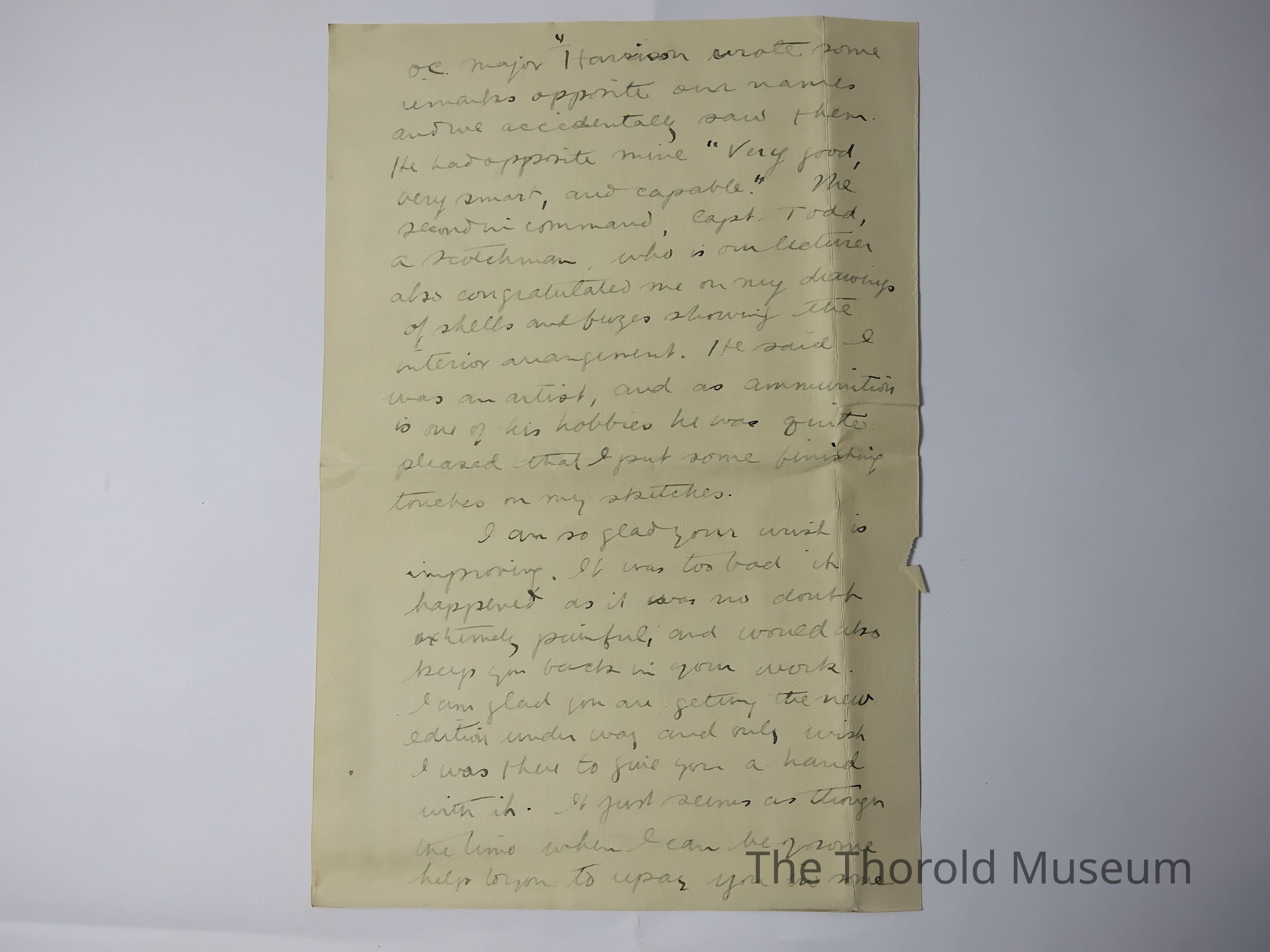 I got 83% on my final exam - that is on the assugate, so I must have done very well in some exams to pull up my bad papers on [??????????] Of [???????] And diving drill. Our good old O. C.mayor Harrison wrote some [???????] [??????] our names and we accidentally saw them. He had [???????] Mine "very good, very smart, and capable" The second in command, capt. Todd, a Scotchman, who is our [?????????] Also congratulated me on my drawings of shells and buges showing the interior [???????????]. He said I was an artist, and as animation is one of his hobbies he was quite pleased that I put some beginning trenches on my sketches.